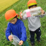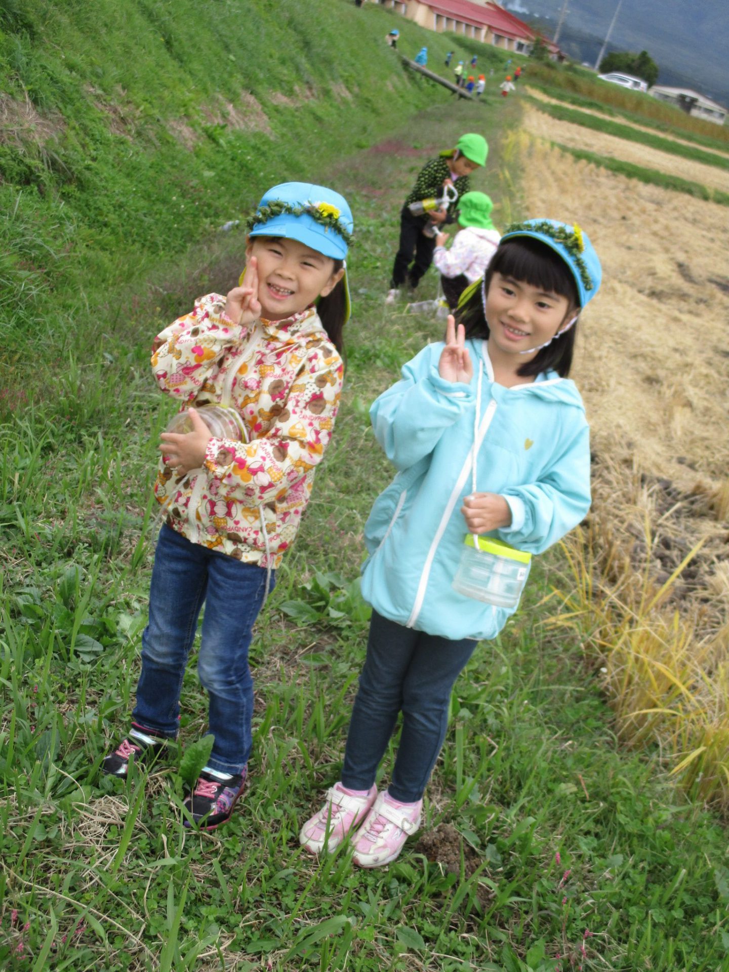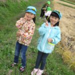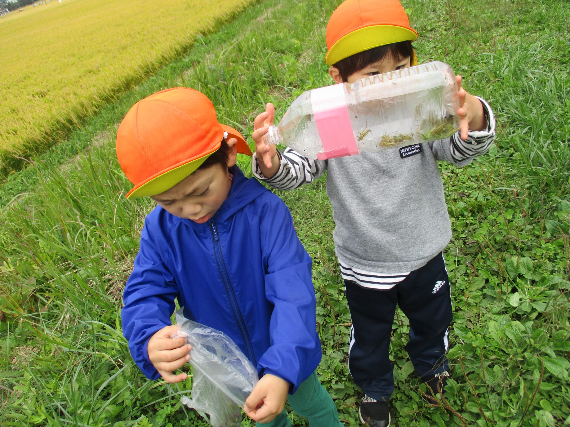 田んぼのあぜ道にはいなごがいっぱい!たくさんつかまえよう!いなごのペットボトルに。「ぼくもう10匹つかまえたよ!見て!」