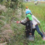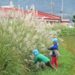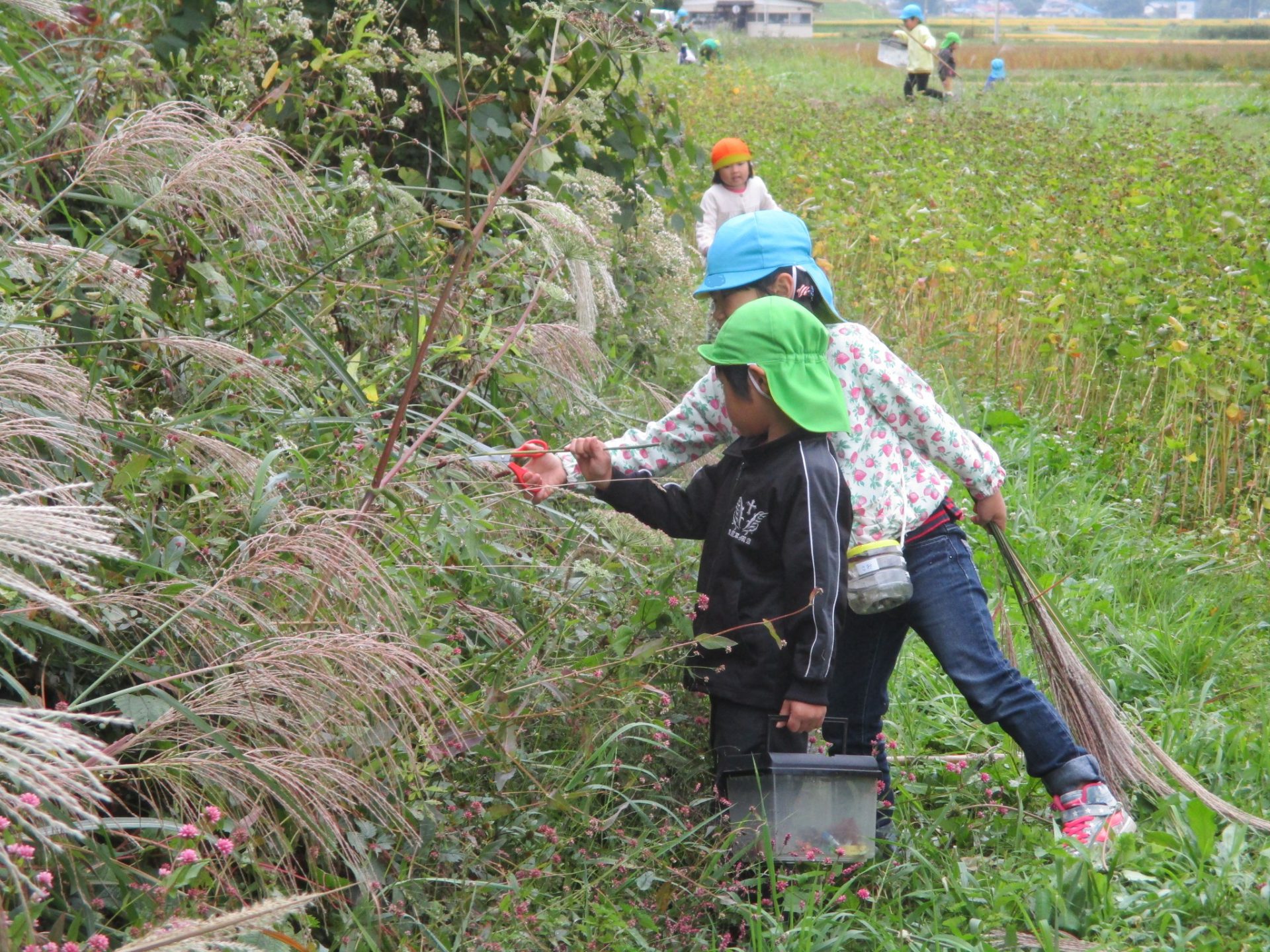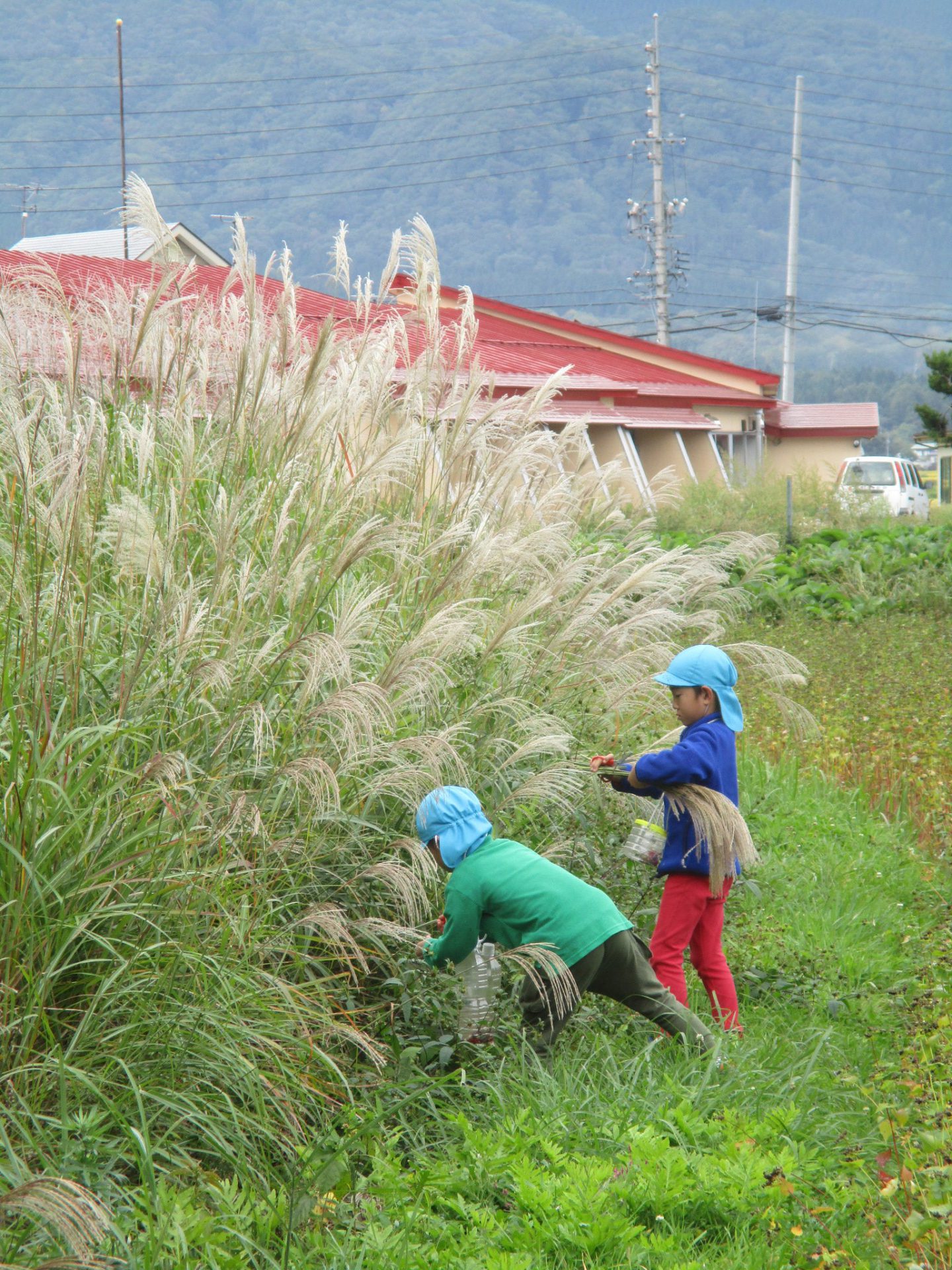 「ぼくもすすき欲しい!」「はいよ!どれがいいの?持ってて?切ってあげるから。」はさみを持てるのは年長さんだけ。気にかけて声をかけてくれます。「すすきほしいひとー!とってあげるよー!」