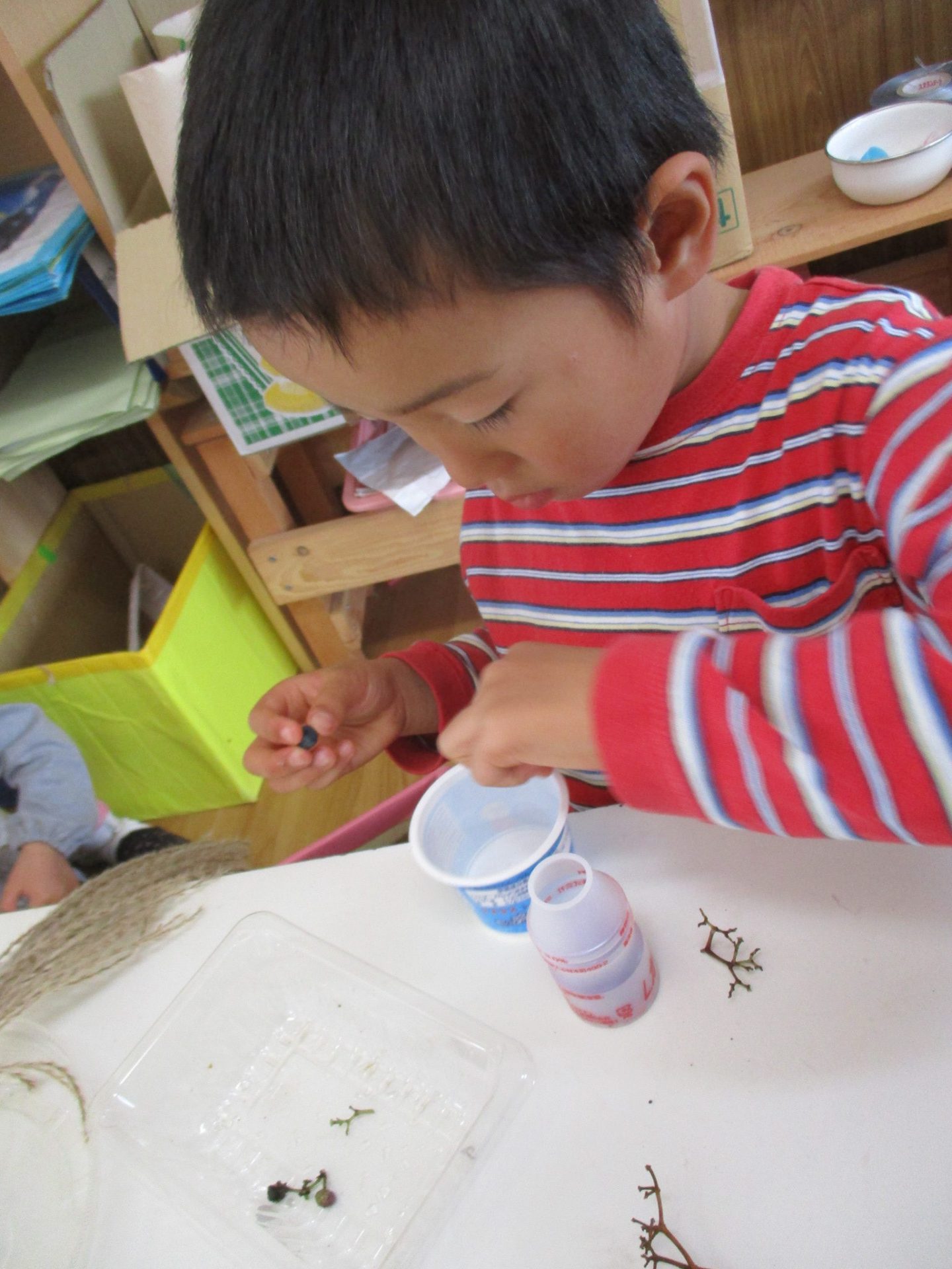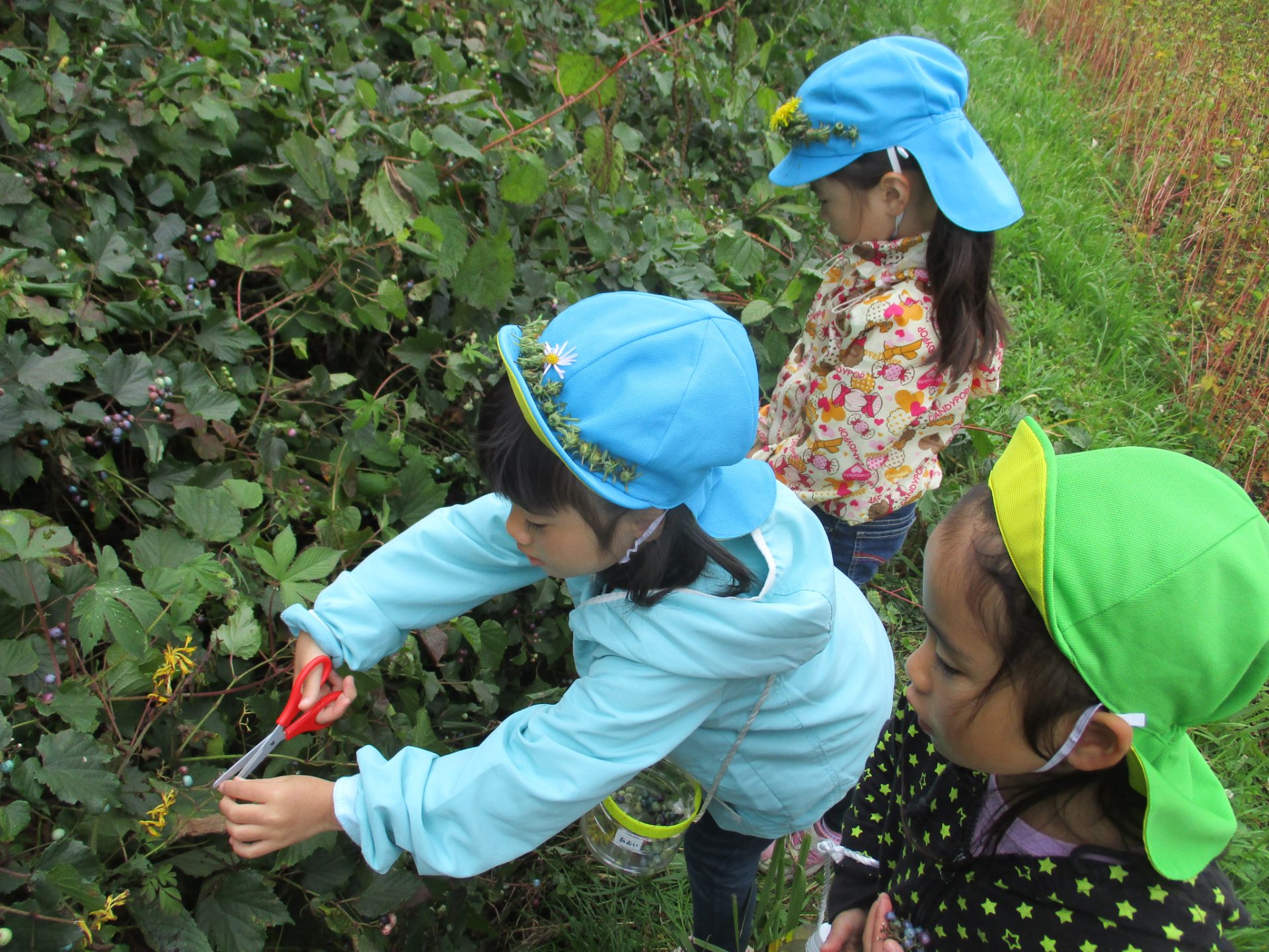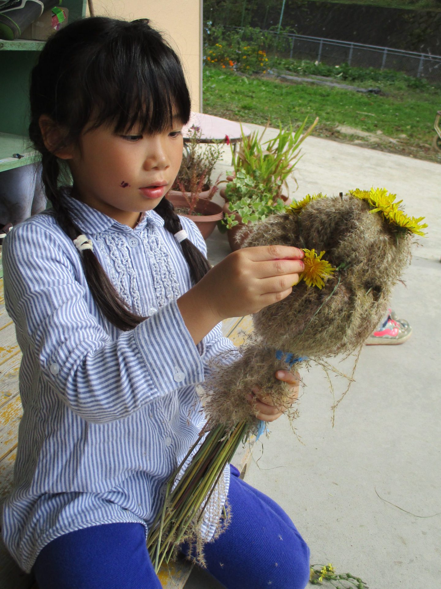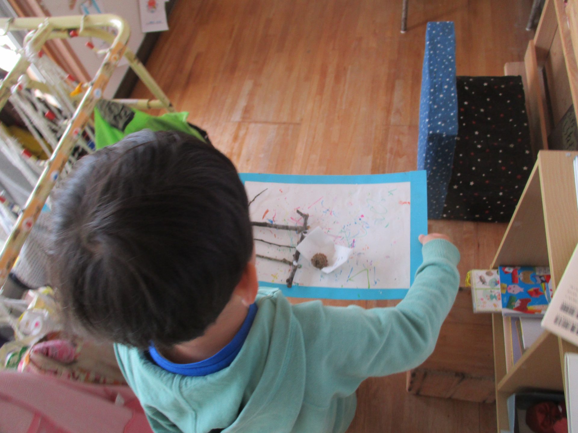 秋の自然からすてきな贈り物をたくさん頂いた子ども達。今まで集めたり、採ったりすることで満足していたのが、こうしたい!ここに使いたい!と目的を持って活動していることに成長を感じます。そして友だち同士で教えあう姿も。教え方も相手の立場に立っことで分かりやすくすることができます。秋の自然を介して友だちとのやりとりがもっと深まり、遊びが発展していくといいなと思います。