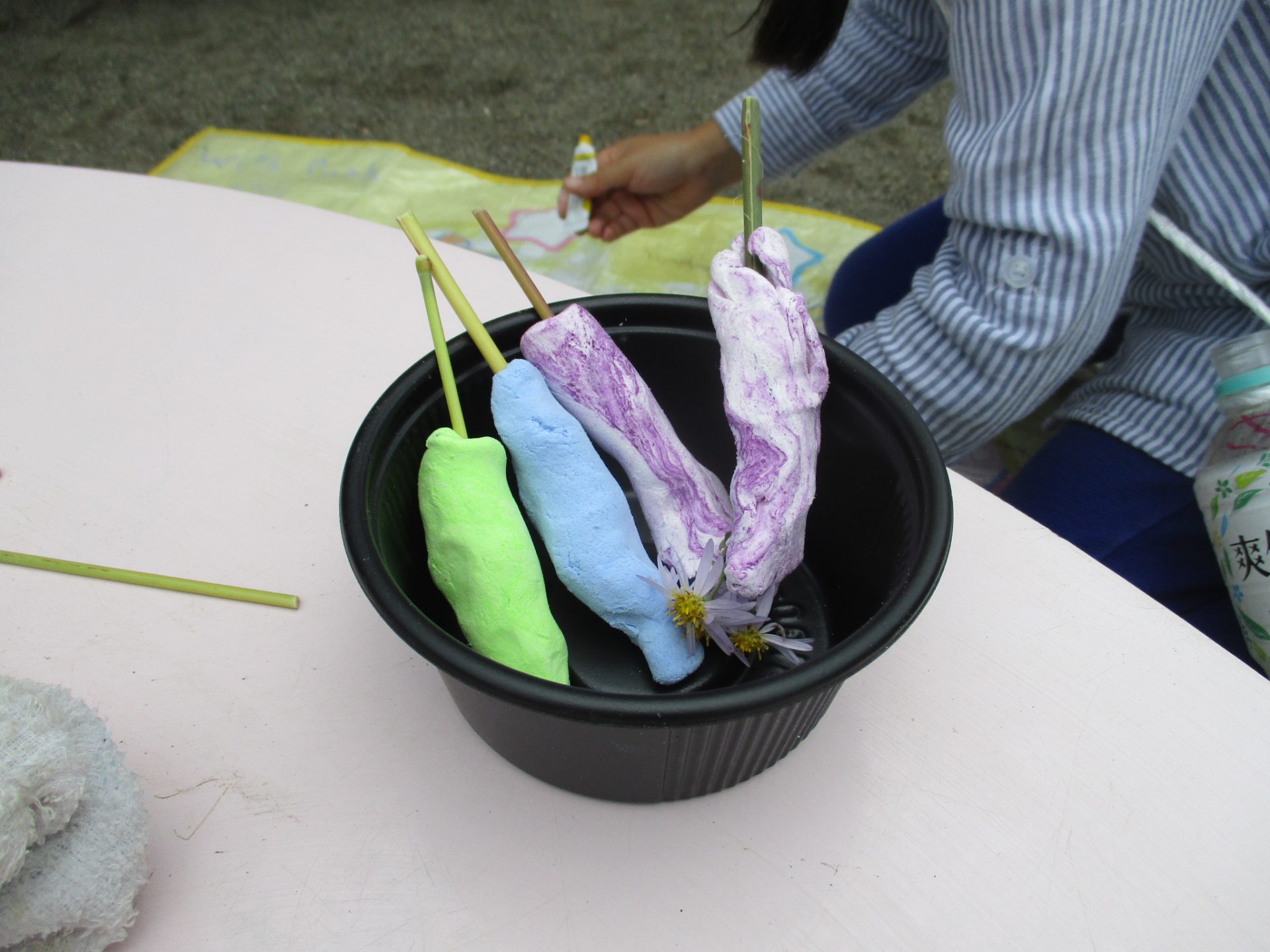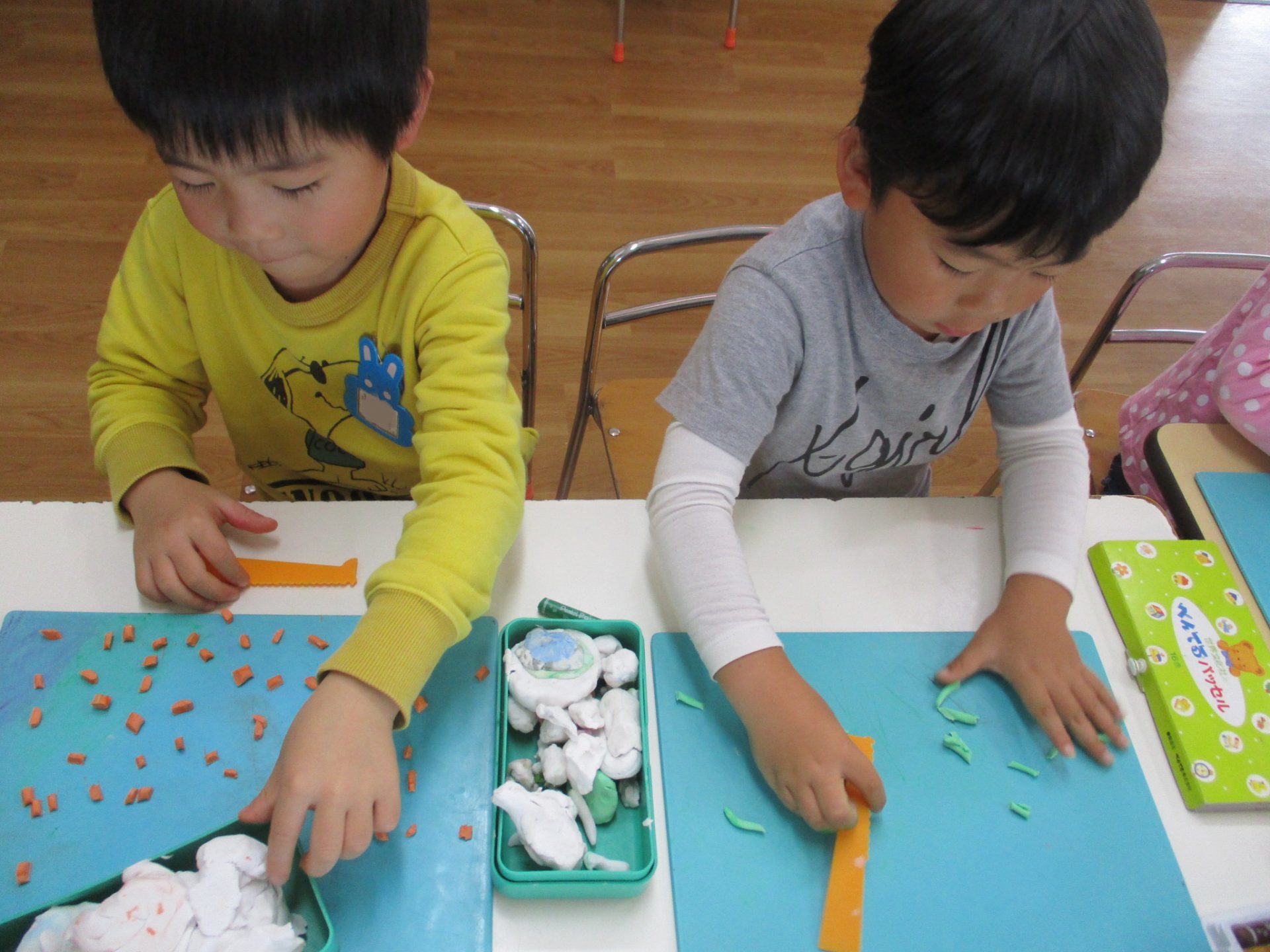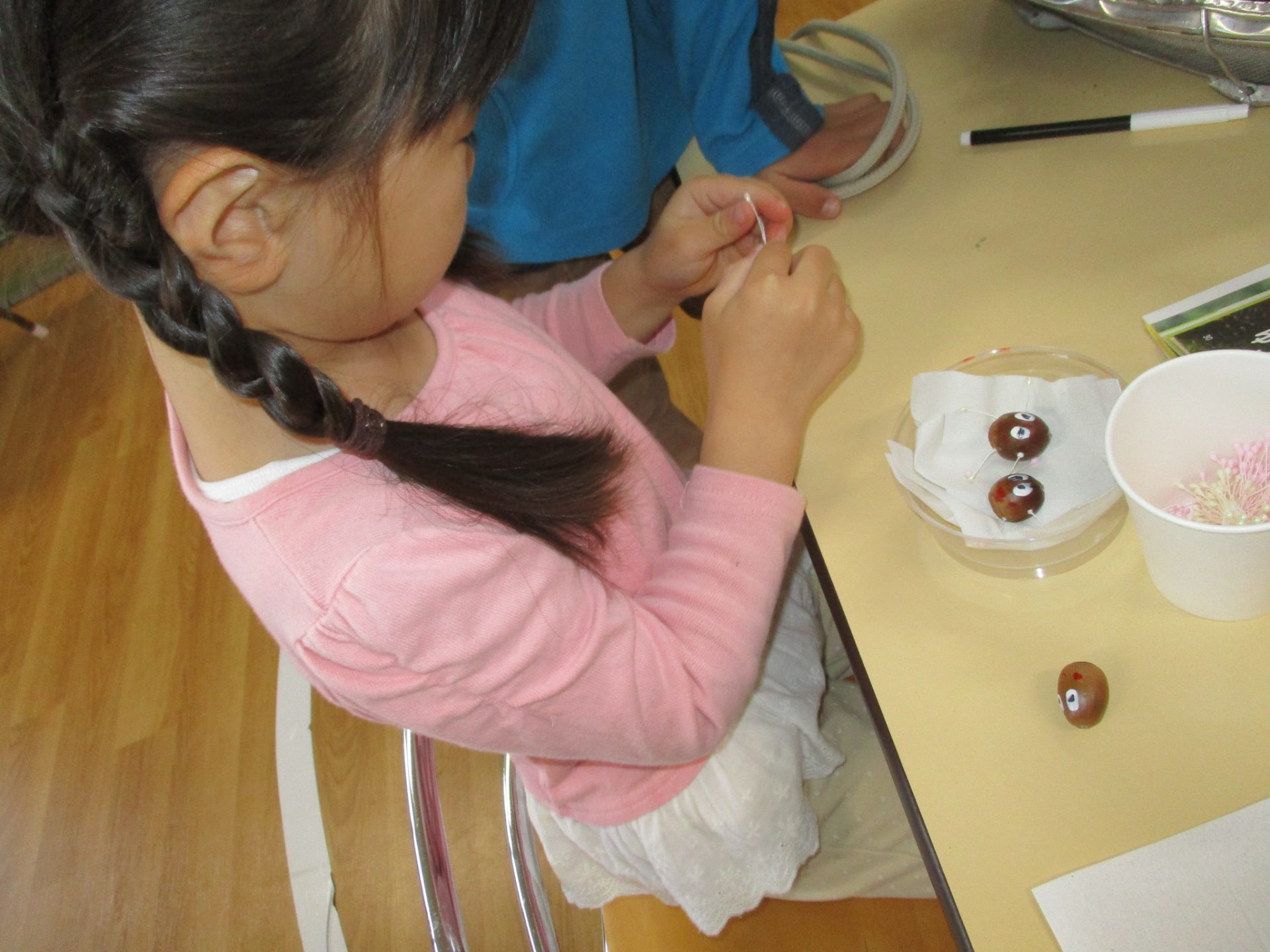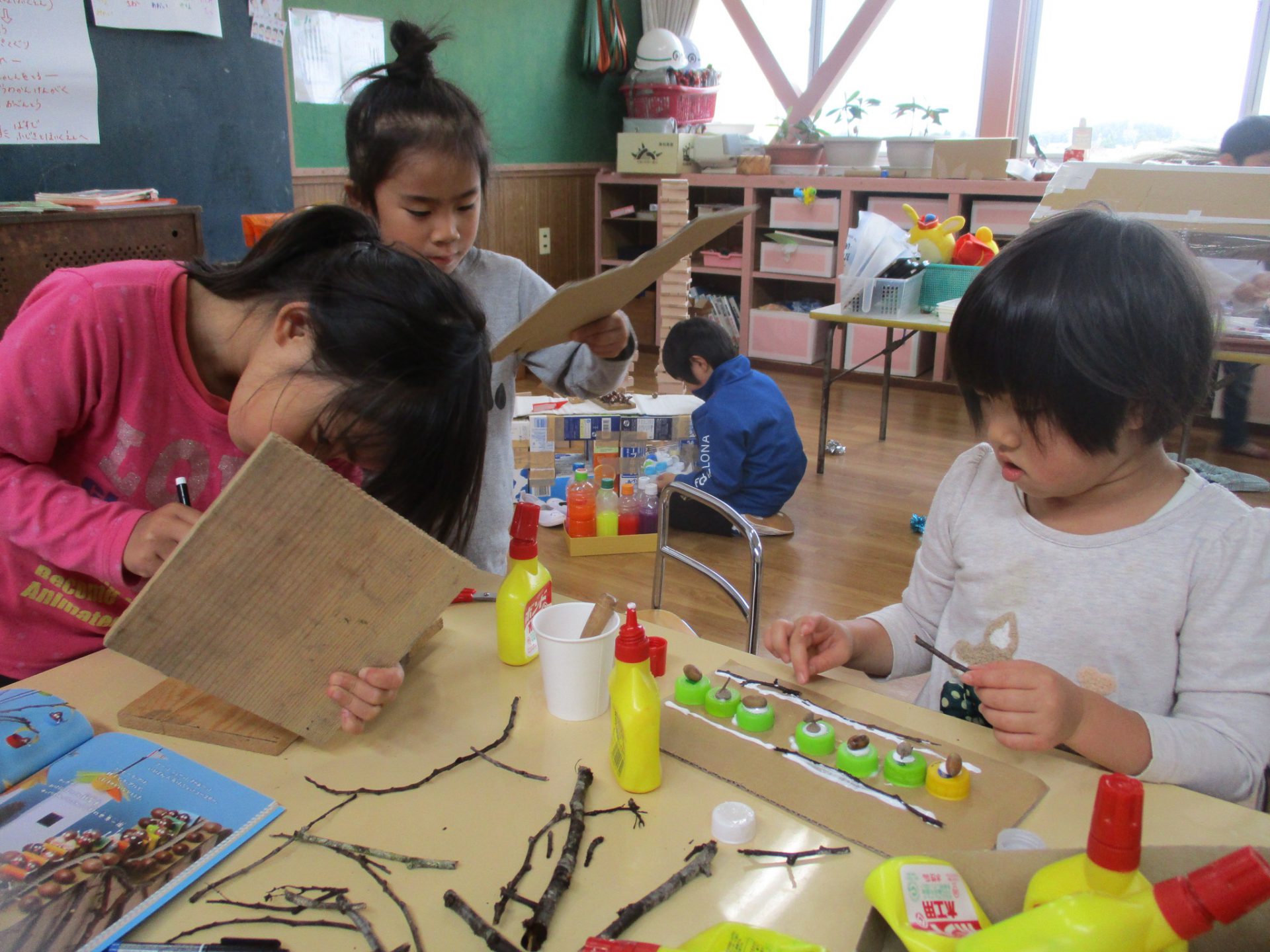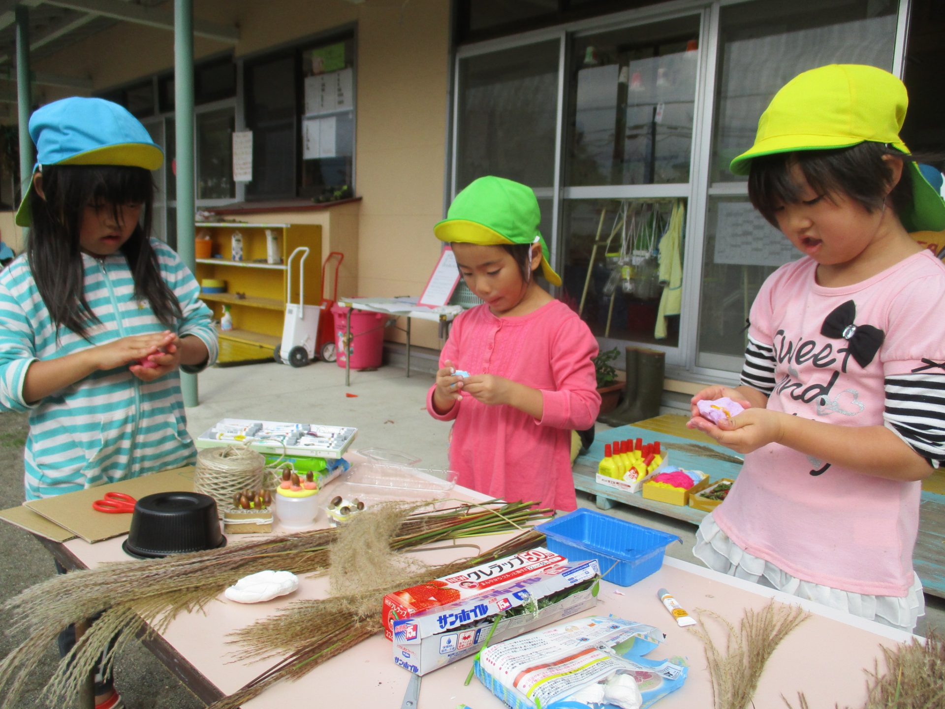 秋の自然からすてきな贈り物をたくさん頂いた子ども達。今まで集めたり、採ったりすることで満足していたのが、こうしたい!ここに使いたい!と目的を持って活動していることに成長を感じます。そして友だち同士で教えあう姿も。教え方も相手の立場に立っことで分かりやすくすることができます。秋の自然を介して友だちとのやりとりがもっと深まり、遊びが発展していくといいなと思います。