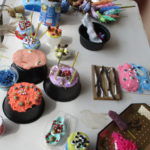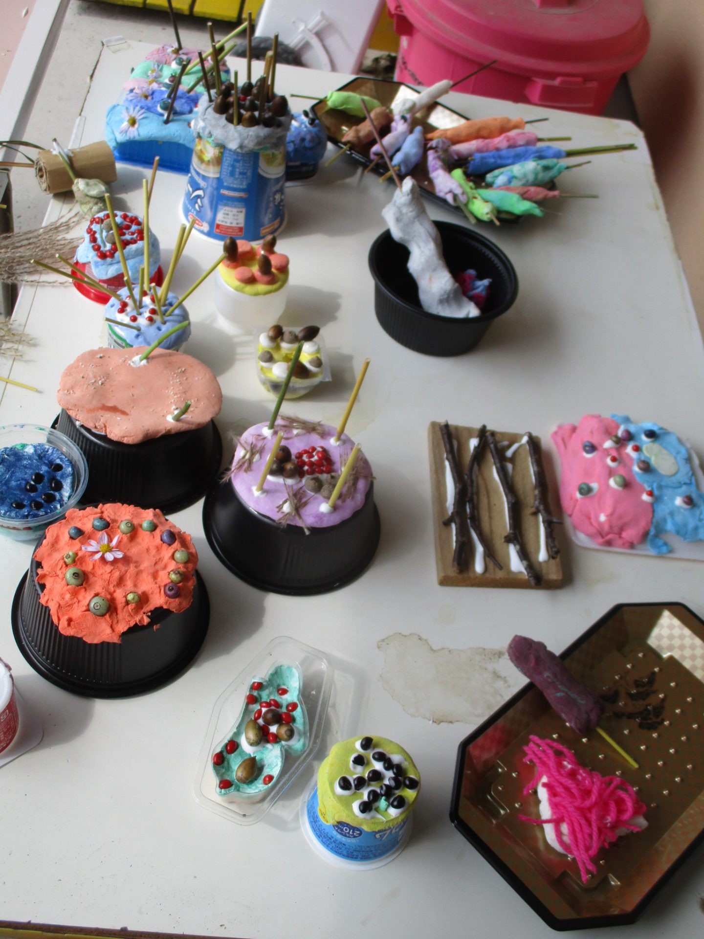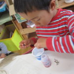 紙粘土と絵の具を出しておくと「これ使ってもいい?」と混ぜて色を付け始めました。部屋で使っている粘土にもクレヨンで色付けして遊んでいるので色の付け方もおてのもの。