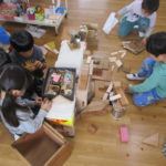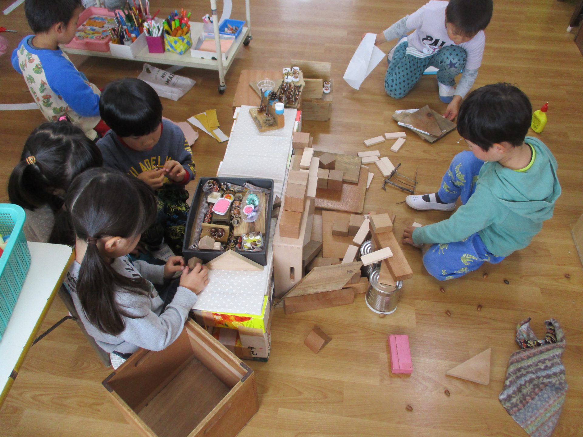 積み木、木の板、箱、何でも使おう! 「ここがご飯食べるところ!」「こっちが寝るところ!」