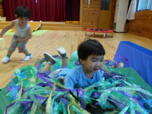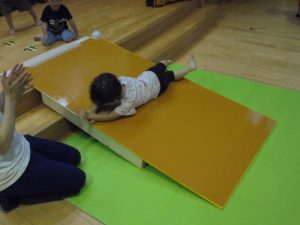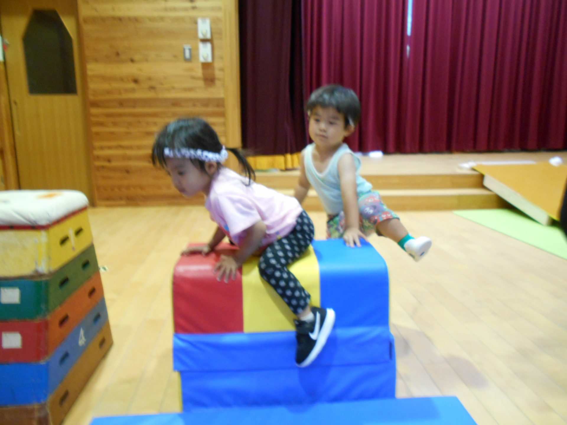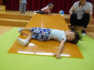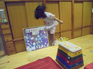 次は、跳び箱の『とびばちゃん』、滑り台の『すべりちゃん』、平均台の『へいちゃん』、ボール遊びの『ばろんちゃん』、トランポリンの『とらちゃん』と遊ぼう!です。