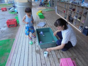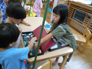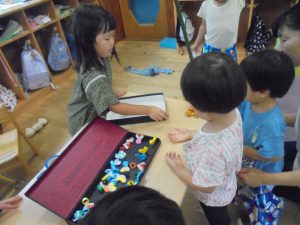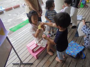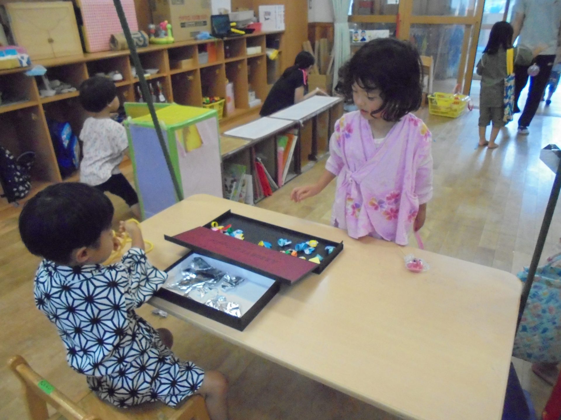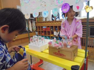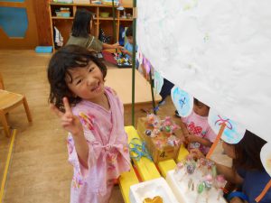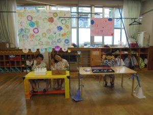 店番は年少さんと年中さん。来年のなつまつりのイメージ作りバッチリですね!