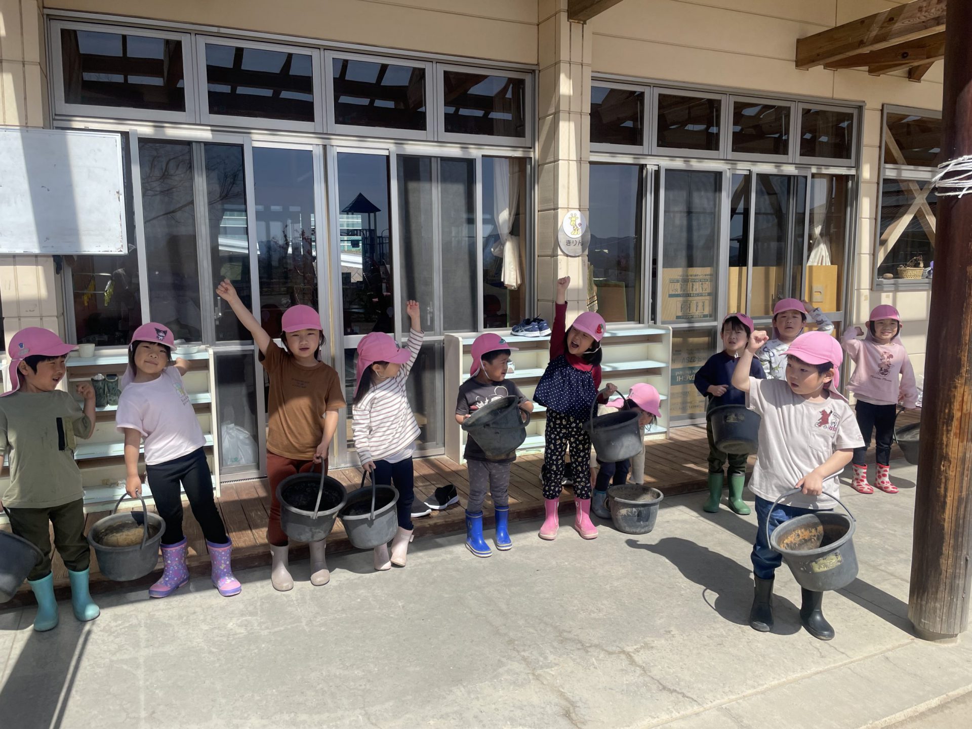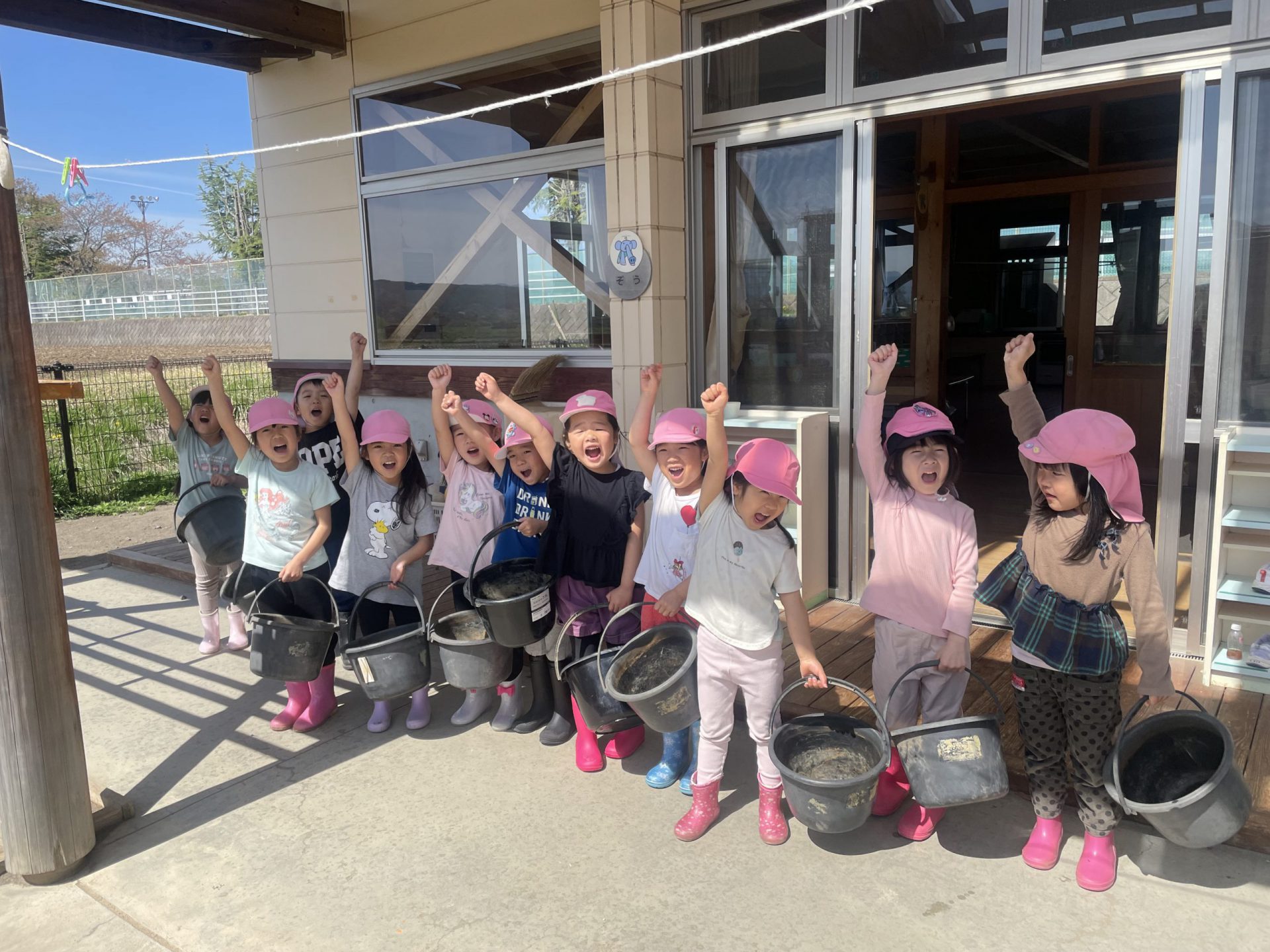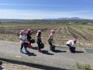 【4月下旬】保育園近くの田んぼから土をいただき、土の入った重いバケツを保育園まで一生懸命運びました。
