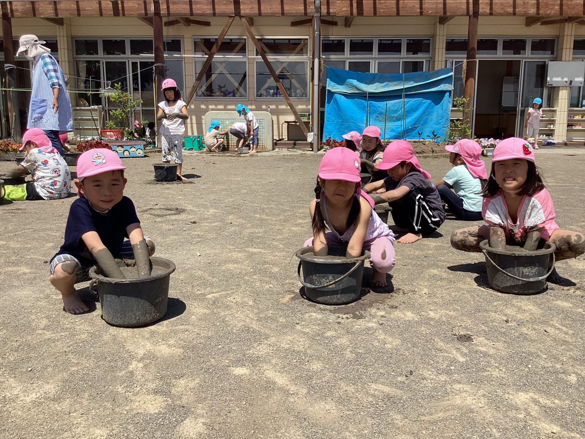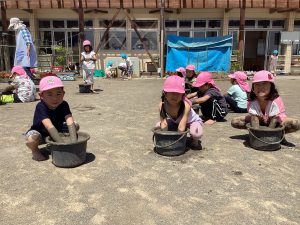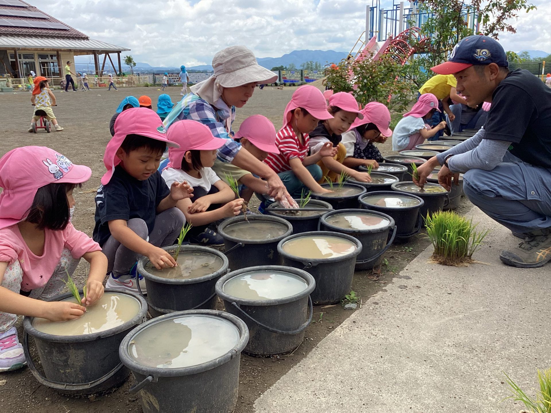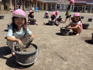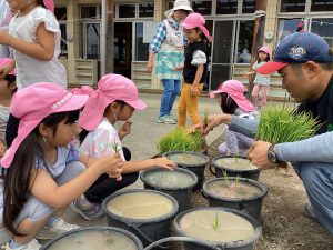 毎日食べるご飯はどうやってできているのか、食べるまでどのくらい時間がかかるのかなど、お米についてより興味関心を持ってほしいと思い、この活動を設定しました。最初は泥に抵抗のある子も多く、「触りたくない」と言っていた子も、今ではバケツの中に水があるか毎日気にかけたりと、お米作りの経験を通して、少しずつ稲に愛着がわいてきた様子が見られます。