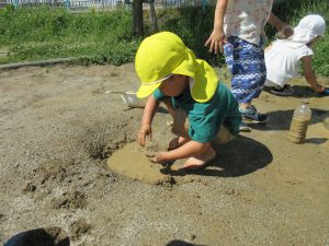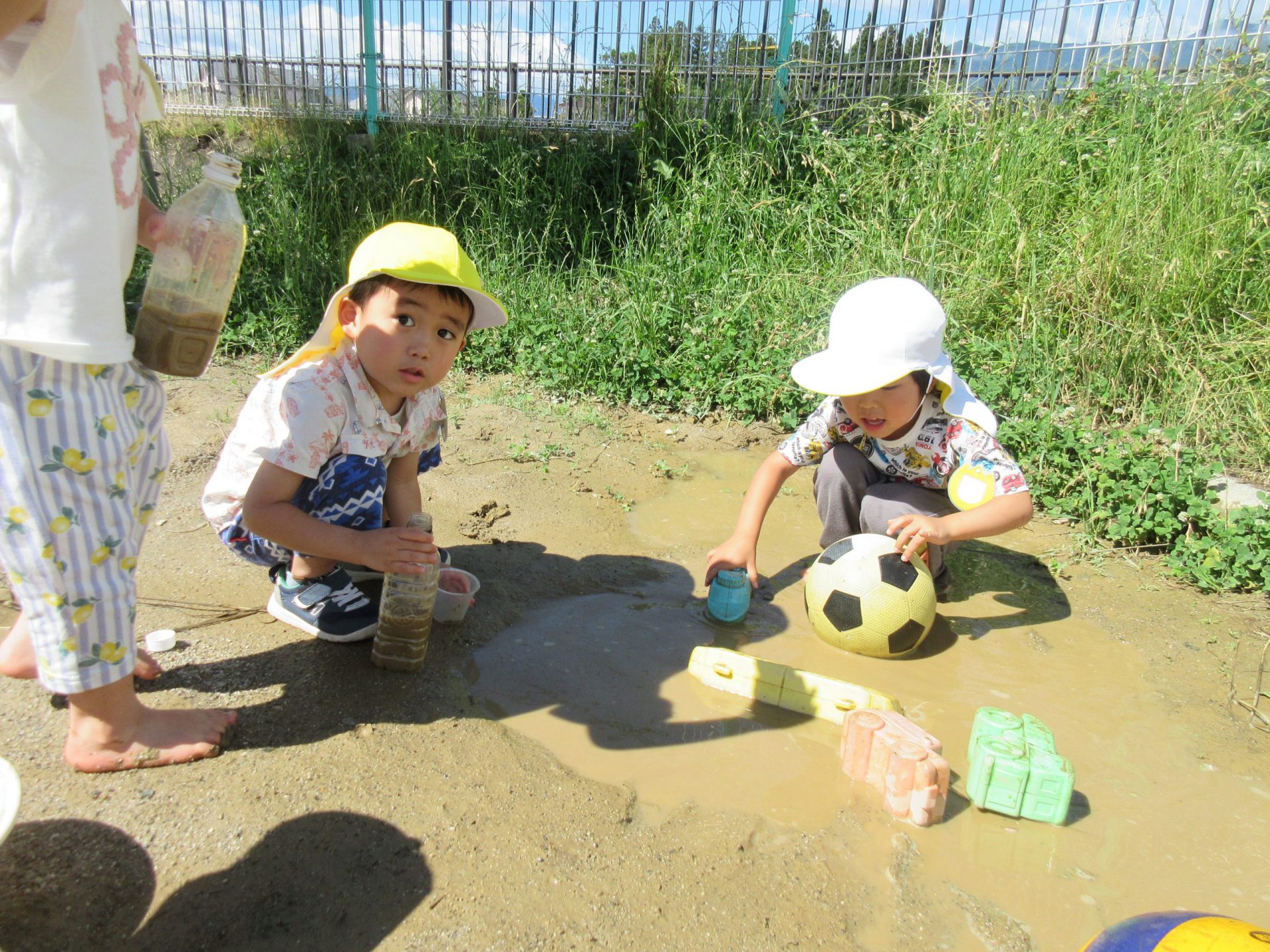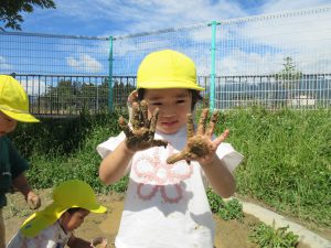 水たまりに足を入れたり両手に泥をつけて感触を楽しんだりして、いつの間にか水遊びが泥遊びに・・・