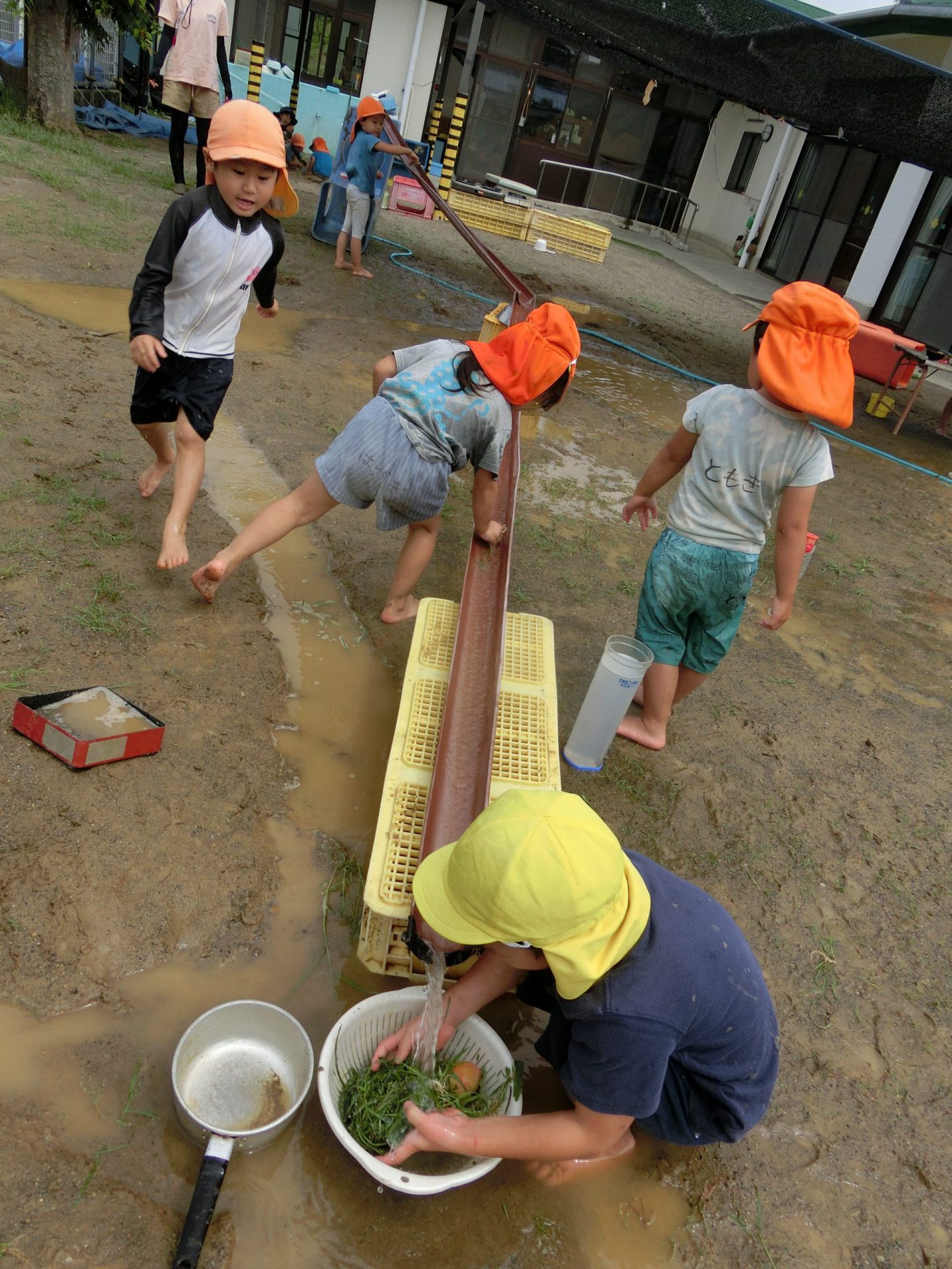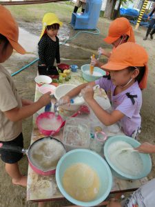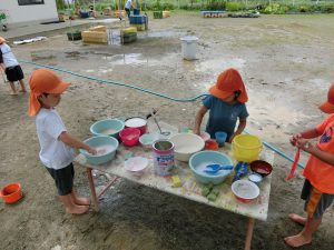 ・曇り空でも遊び方を工夫すると泥んこ遊びが十分に楽しめるため、様々な遊びを通して五感を育んでいきたいと思います。