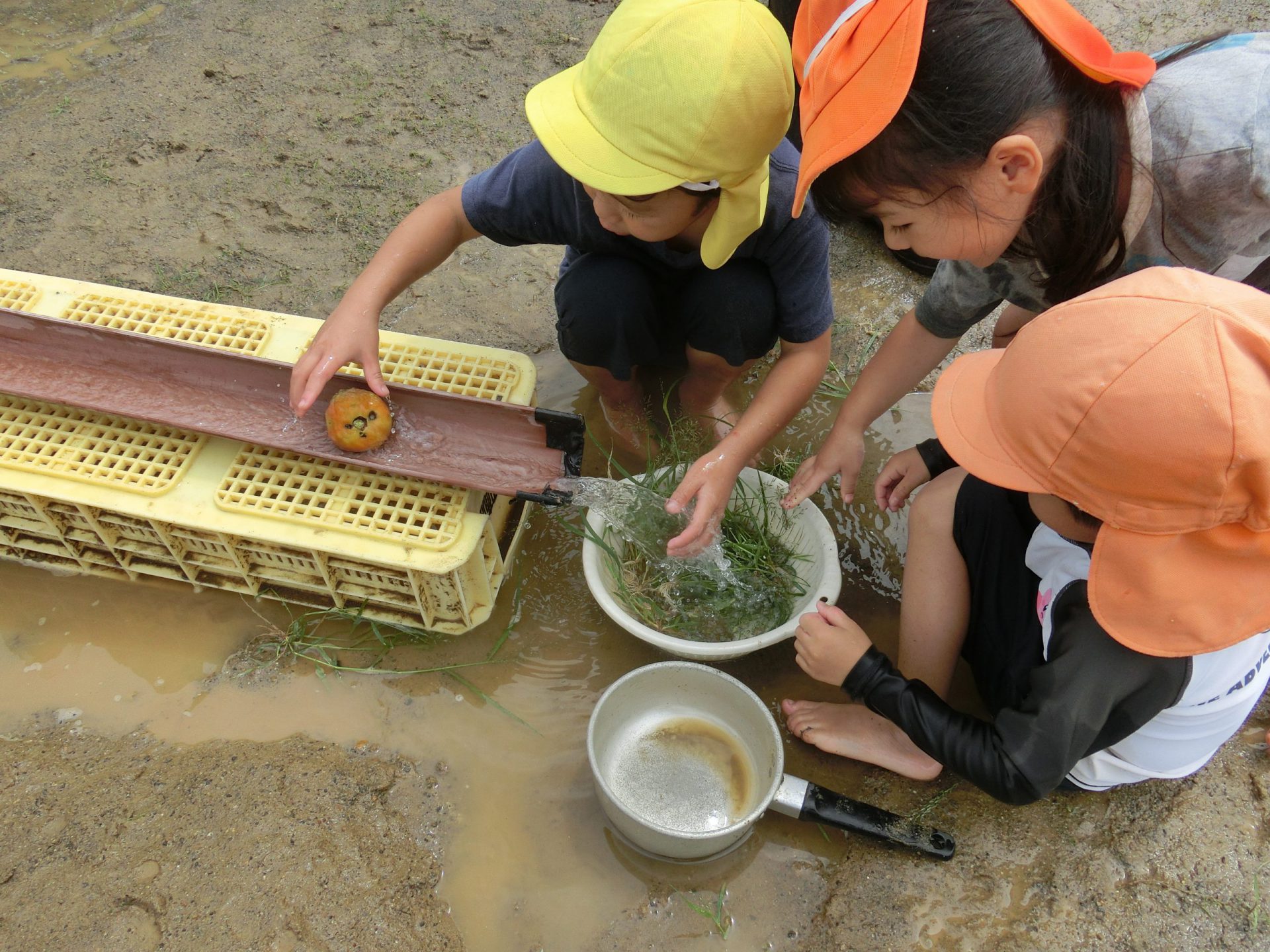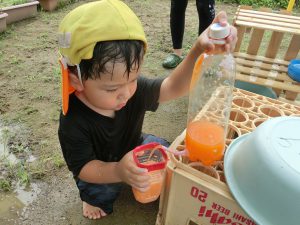 ・どうすれば泡に色がつくのか、とよから草がスムーズに流れるのか等、保育士が伝えてしまうのではなく、子ども達が自分で考え試し、試行錯誤することを大事にしています。