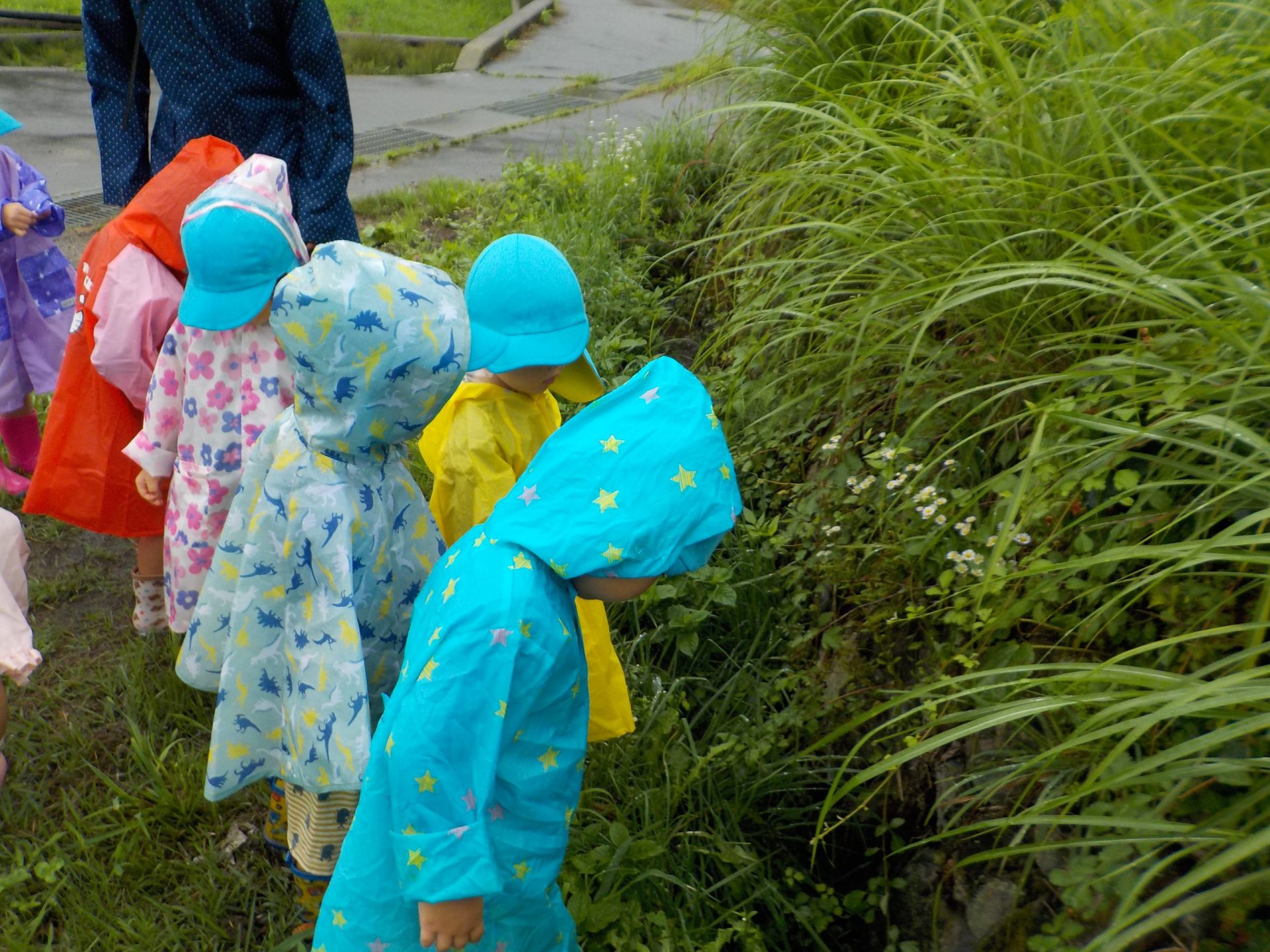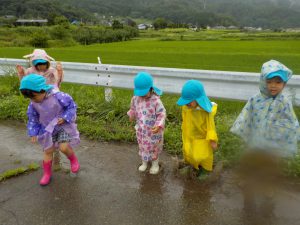 ・今年度2回目の雨降り散歩となり、1回目の経験から子ども達が雨の中でしか味わえない自然物を見つけたり、音や雨粒などの自然事象を感じたりしてほしいとねらい、雨降り散歩に出かけました。保育士のねらいを超えるほど子ども達は、真剣に生き物を探したり、雨水の中で楽しさを味わっていました。経験からこうしてみようとする気持ちが生まれるのだと気づかされました。