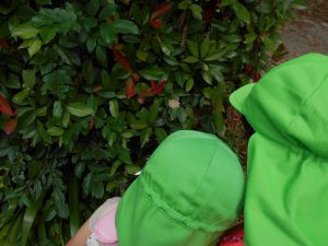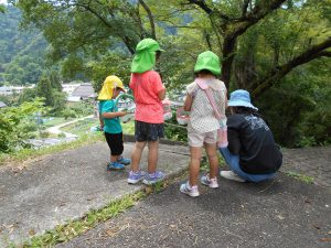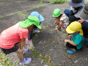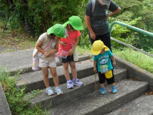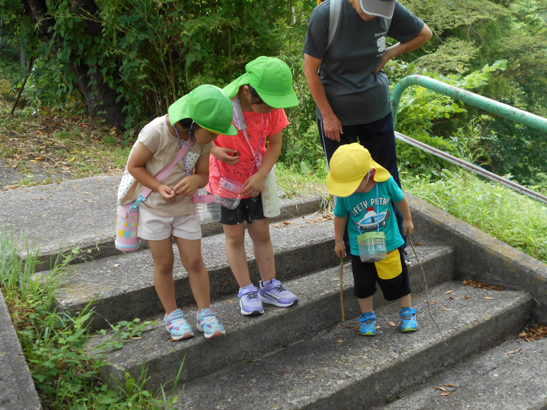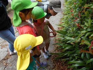 「セミの抜け殻を探したい!」と梅雨の合間を見て、園の周辺に散歩に出かけました。
