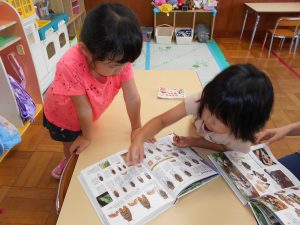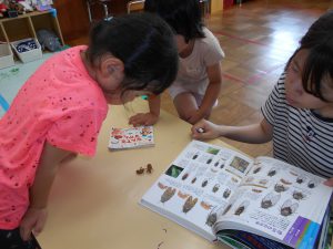 セミの抜け殻と図鑑をじっくりと見比べて観察していました。