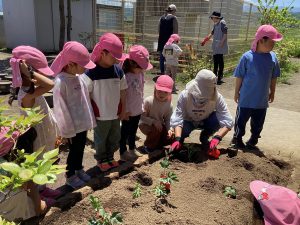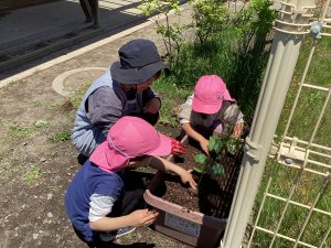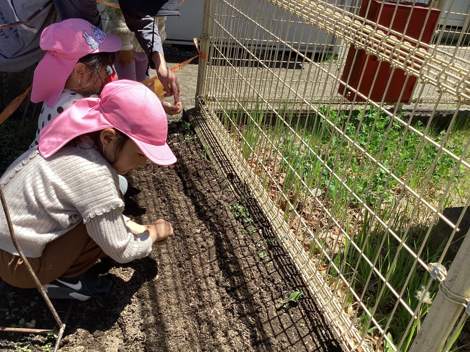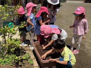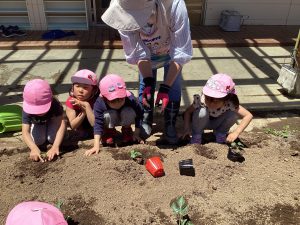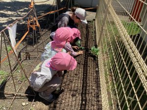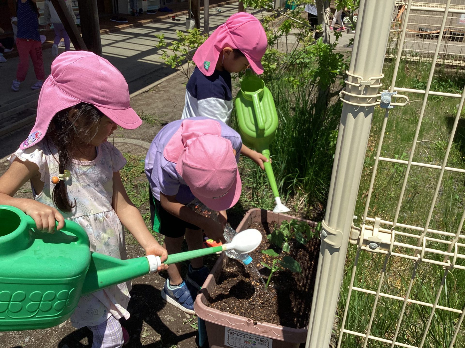 野菜作りを通して、自分たちで世話をし、育てた野菜を収穫する喜びを味わってほしいと思い、この活動を設定しました。毎日の水やりについては、最初、あえて保育者から声かけしなかったのですが、時間が経つにつれて乾いていく土を見て、「野菜さん、のど乾いてるかも!」と子ども達から気づき、今では率先して毎日水やりを行っている子ども達です。