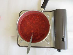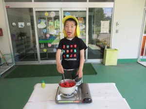 ヘタを取り、砂糖を入れ、煮詰めます。子どもたちには、かき混ぜてもらうお仕事を頑張ってもらいました。