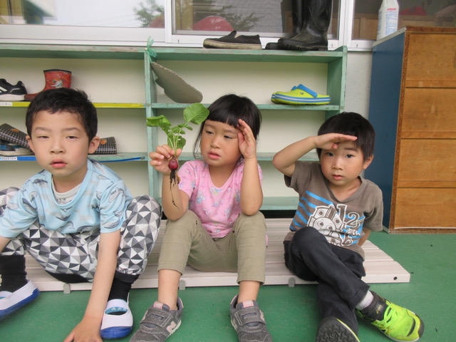 また、二十日大根の中に色の違いに気づき、「色違う!」とつぶやいていました。