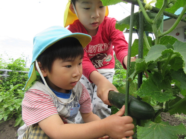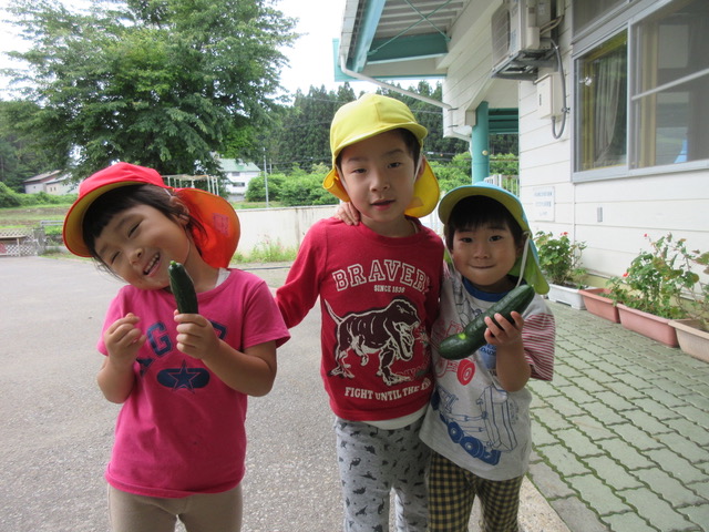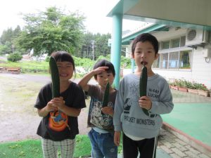 収穫している時に、「ここにでかいキュウリがあった」「キュウリが棒に挟まって採れないけどどうする?」「引っ張れば採れるんじゃない」と会話して、実際に引っ張ってみると無事に採れて、「やった!採れた」と嬉しそうに二人で喜んでいました。