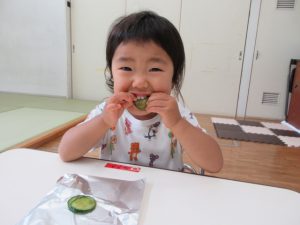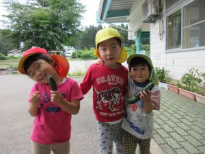 3つ目はキュウリです。畑では大きく育ったキュウリをみて、驚きながら、嬉しそうに収穫しました。 そしてそのキュウリも…
