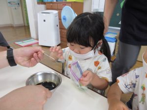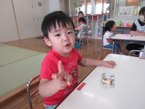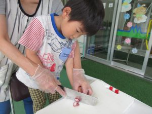 子どもたちに切ってもらいました。やっぱり見ている保育士はちょっとドキドキ…