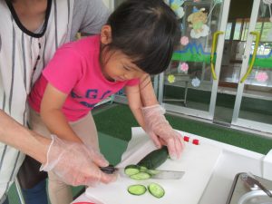 春に保育園の畑に様々な野菜を植え、水やりや草取りなどの世話をして育ててきた野菜を収穫し、自分たちで調理をして食べました。