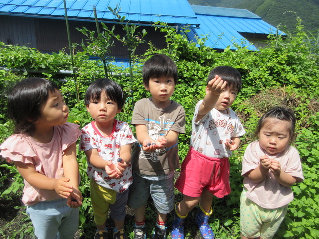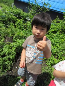 最後はブルーベリーも収穫してその場でパクっと食べました。味の感想を聞くとカメラに向かってグーポーズ!
