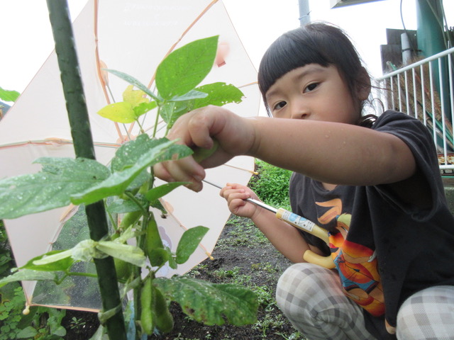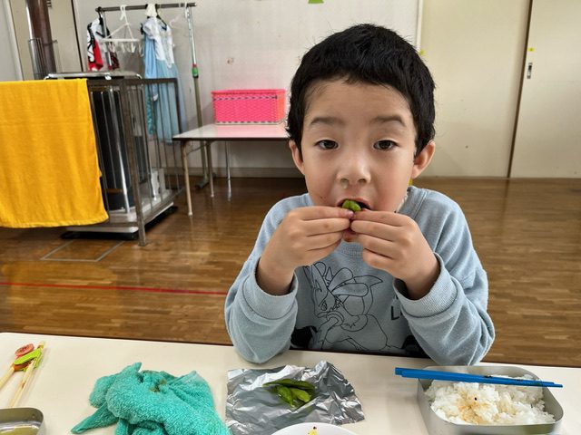 4つ目は、枝豆!枝豆も収穫し、一緒に食べました。量が少ししか収穫できず、一人3つほどしか食べれませんでしたが、これも「うまい!」と言っていました。