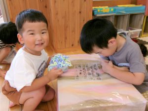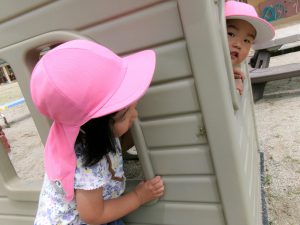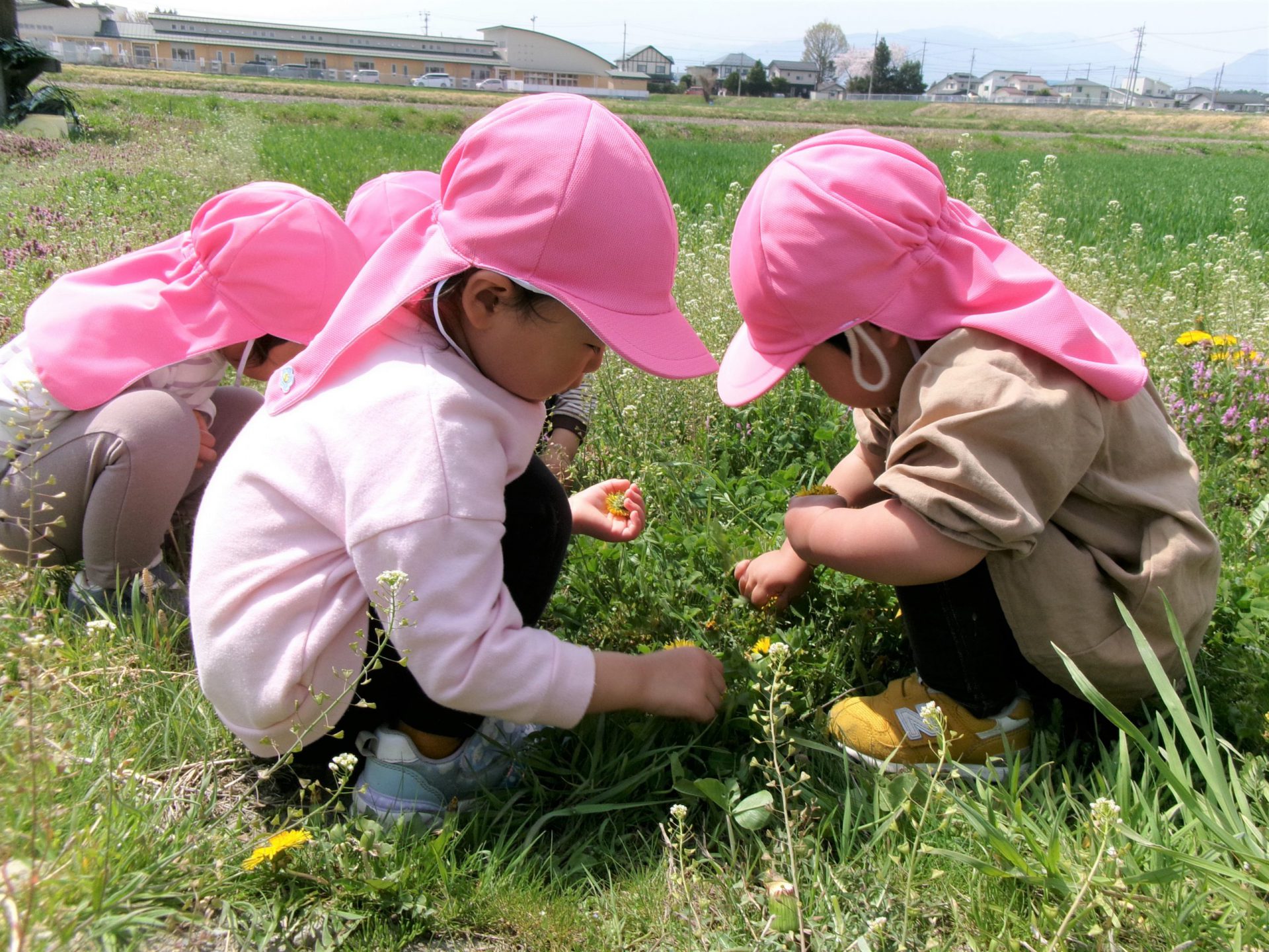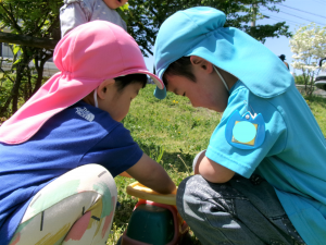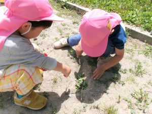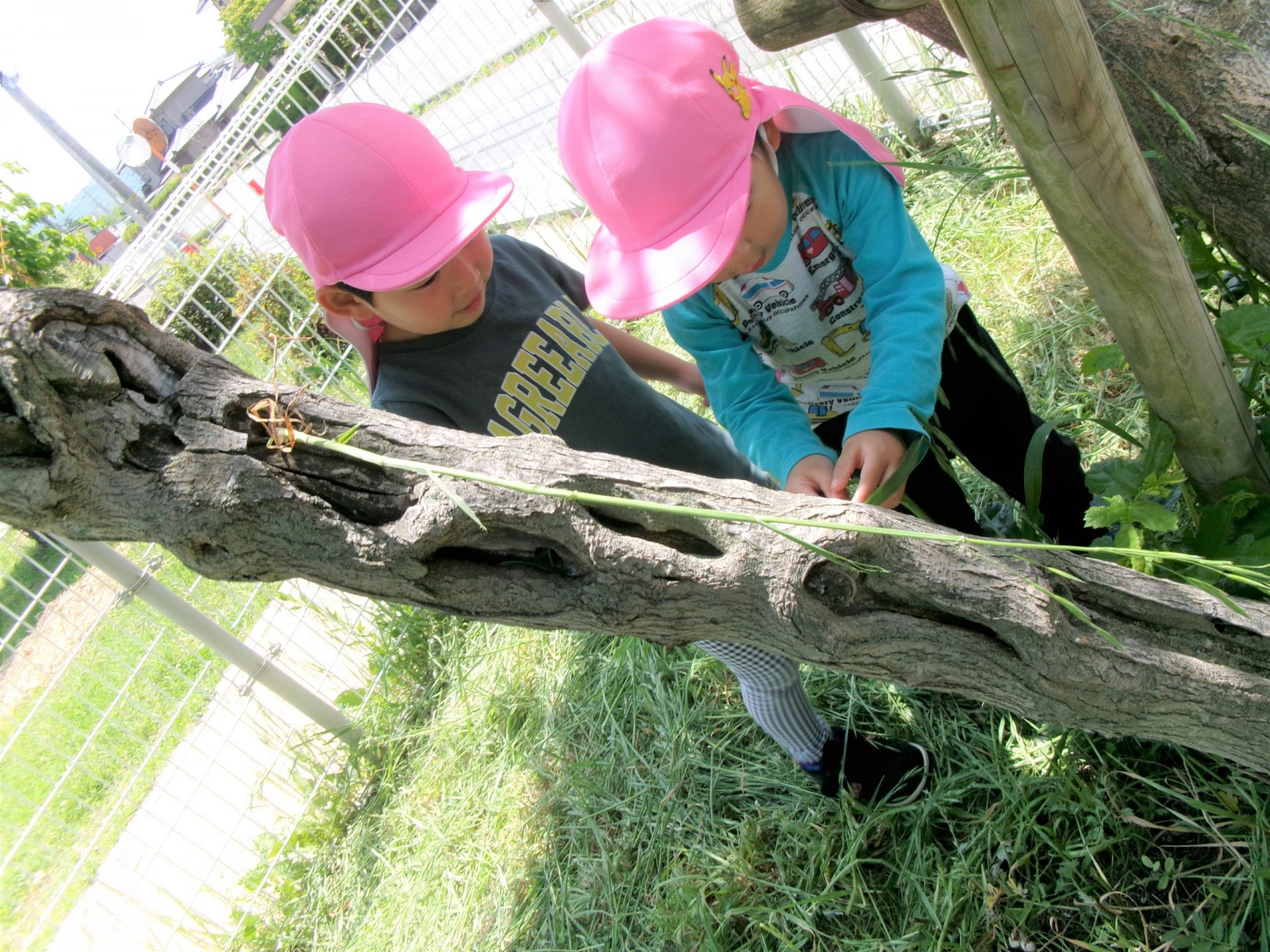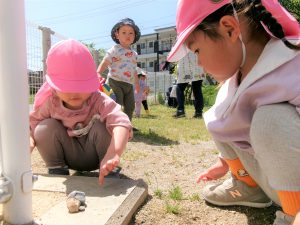 ・園庭に自然と生き物がいることで、はじめは力加減がわからなかったり、「イヤ!」と言っていた子もふれ合っていく中で、優しく接したり友達のように心配したりする姿が増えてきました。これからも、様々な生き物と触れ合う機会を大切にしていきたいです。