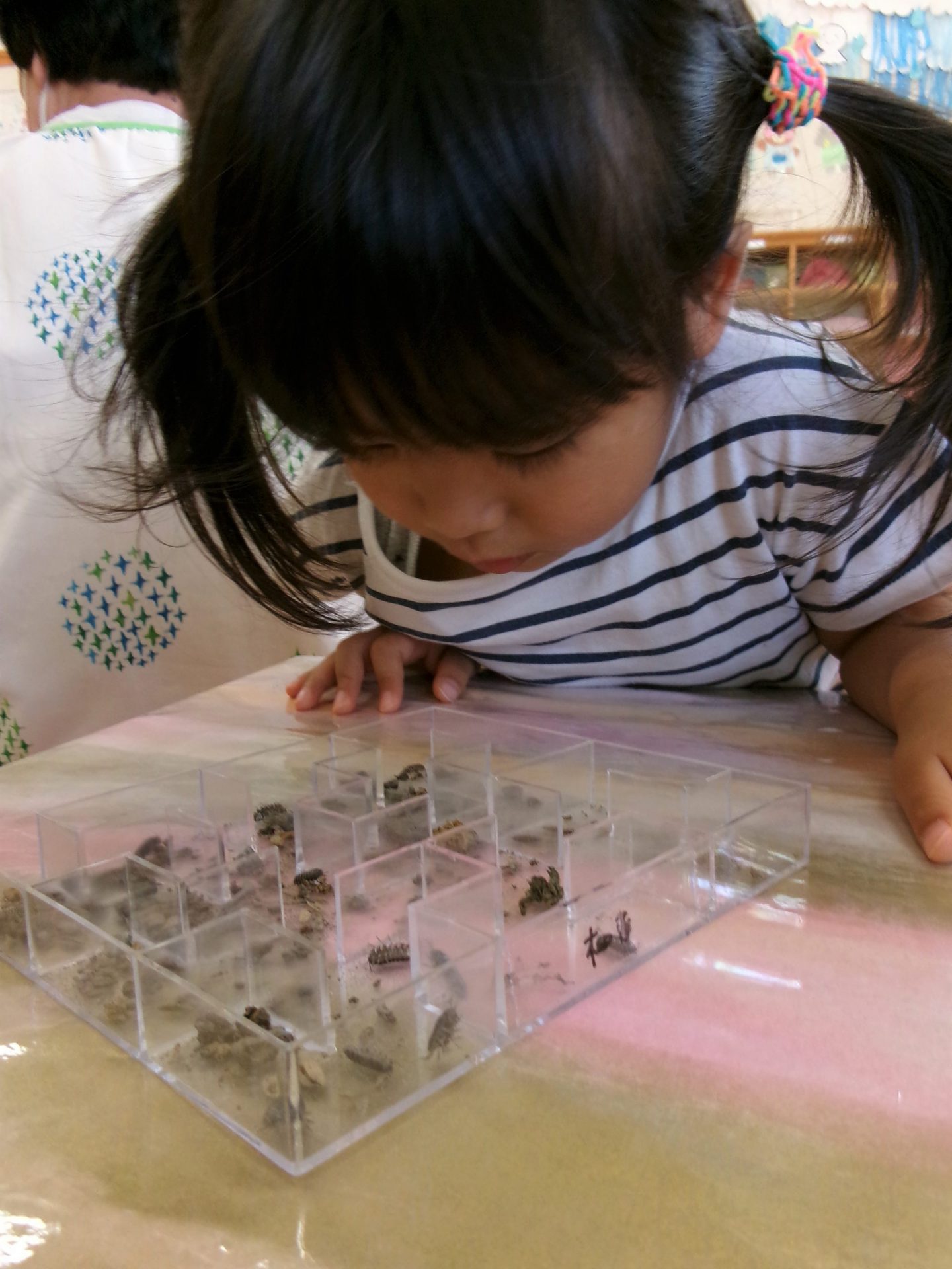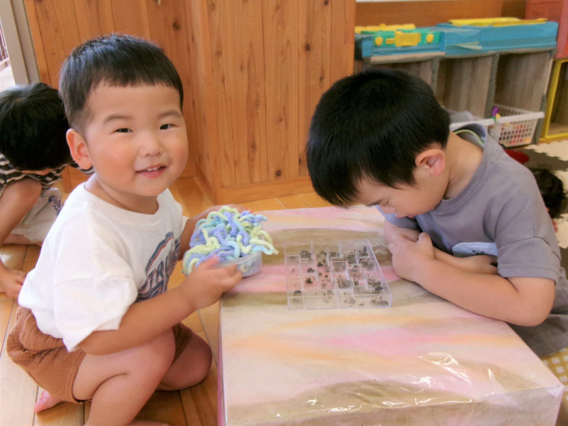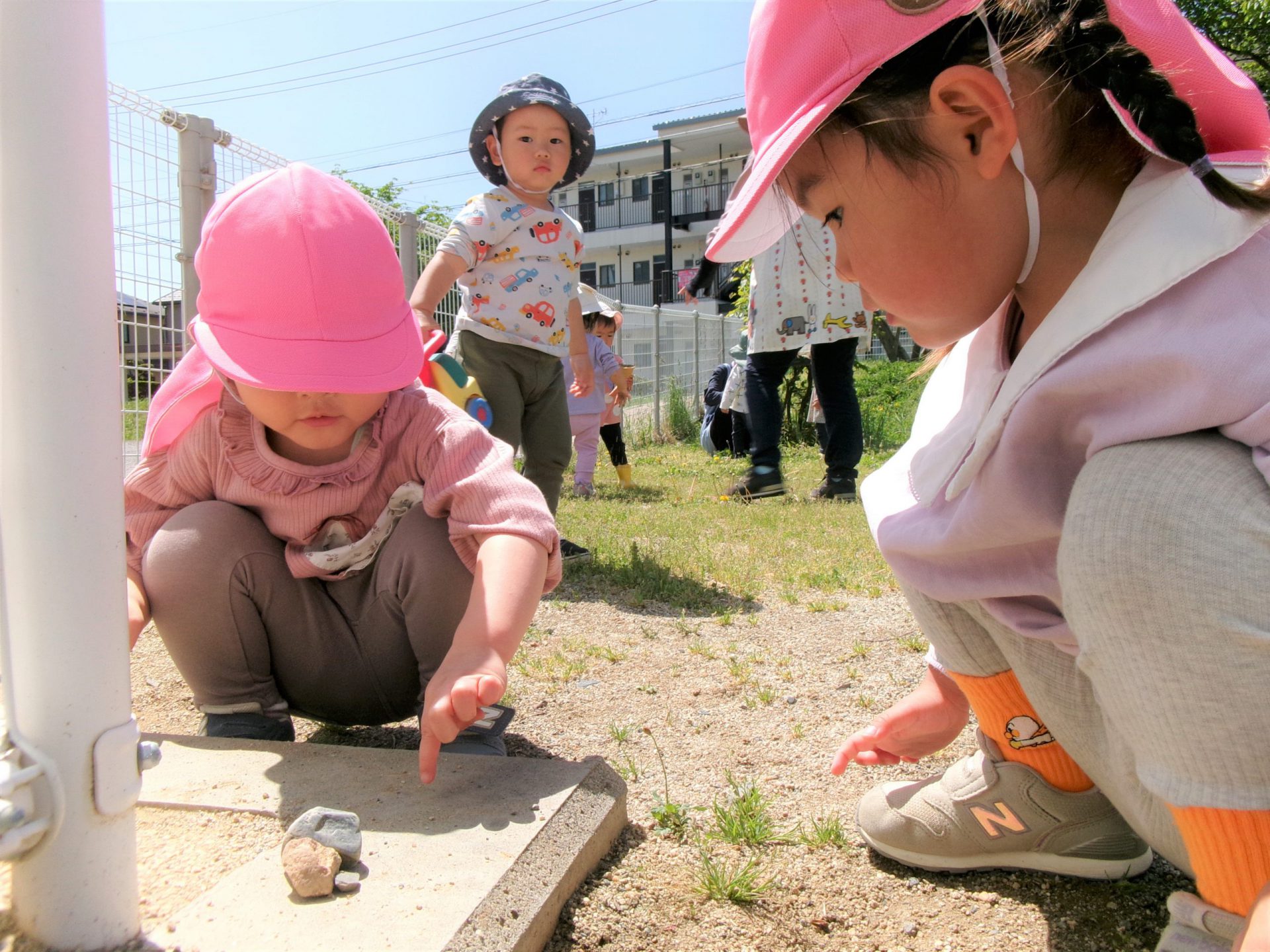 「ありさんいたー!」が子どもたちの合図。ありを手に取って「くすぐったーい」と笑ったり、「これがお父さんで、こっちがお母さんで…」と見立てたりして遊んでいます。