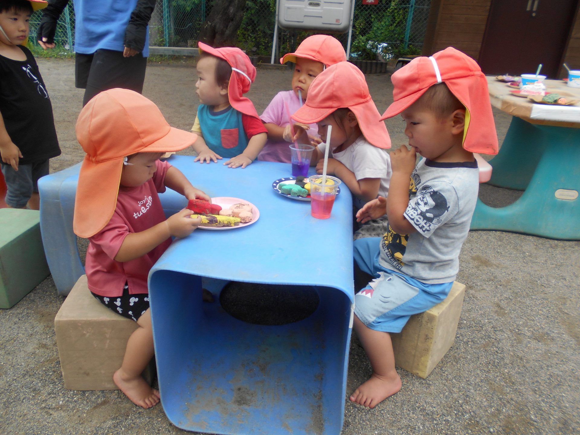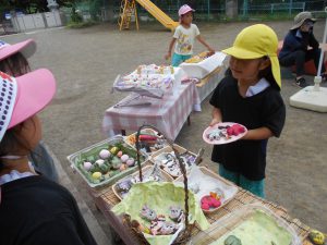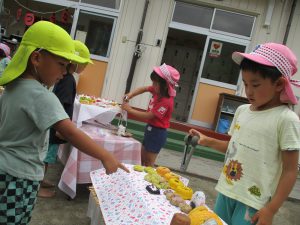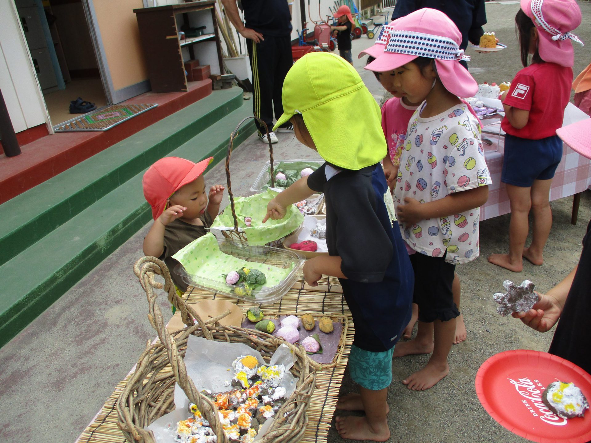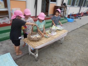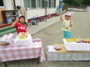 0歳児の子も保育士と一緒に参加したり、1歳児の子が売り子になったり、年長児も売り子だけでなくお店屋さんに買いに行くことも楽しみました。