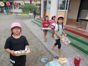 楽しい時間はあっという間ですね。「閉店で~す」と終わりを知らせる年長さんの声。みんなで次のお店屋さんの日を楽しみにしながら片付けをしました。
