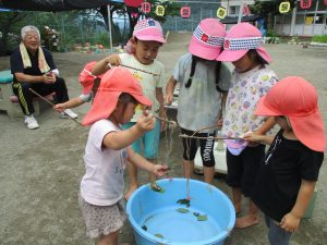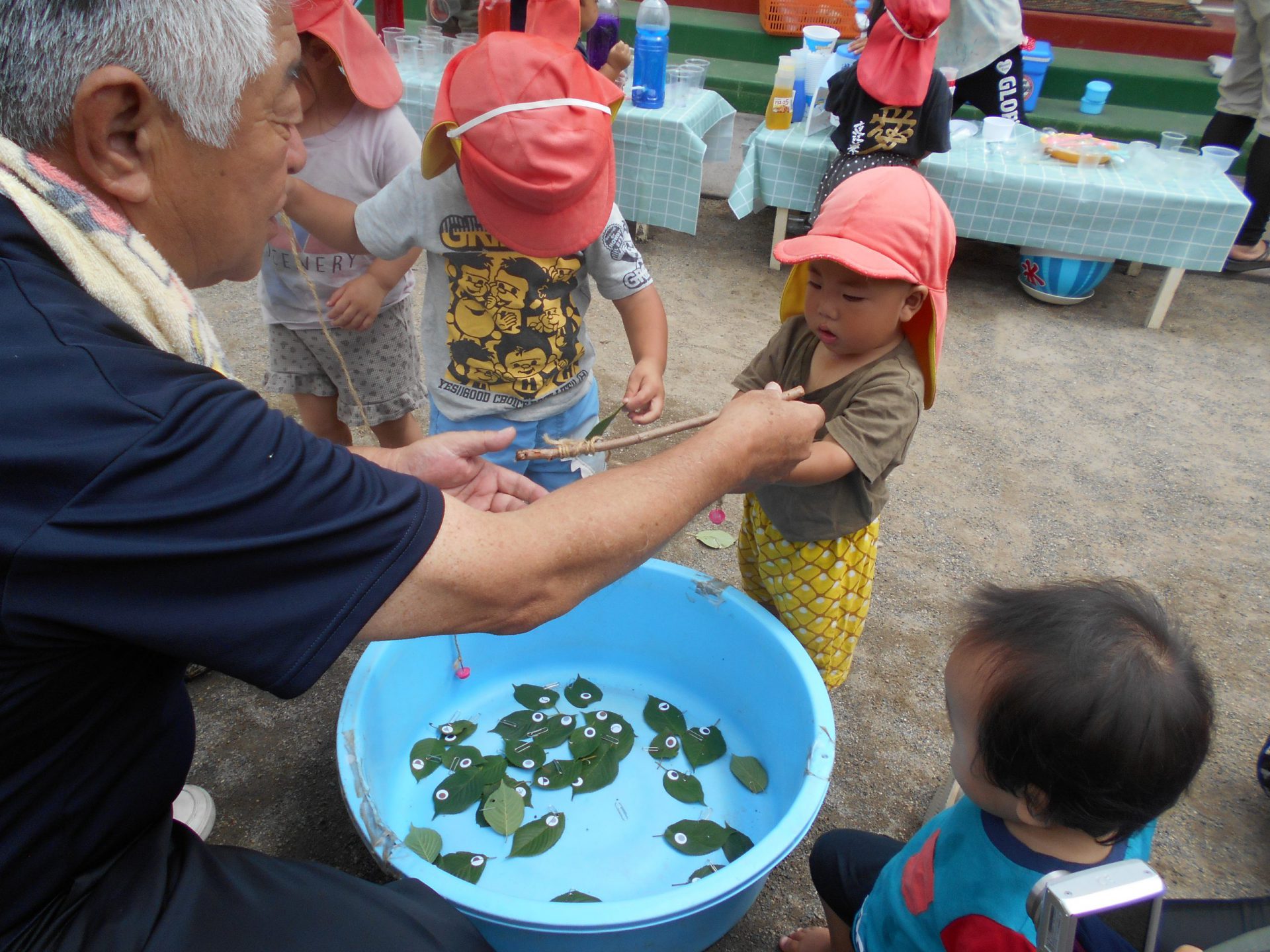 園庭の葉っぱを使って魚釣りコーナーも出店され、園長先生も一緒に楽しみました。