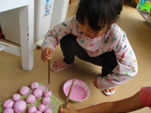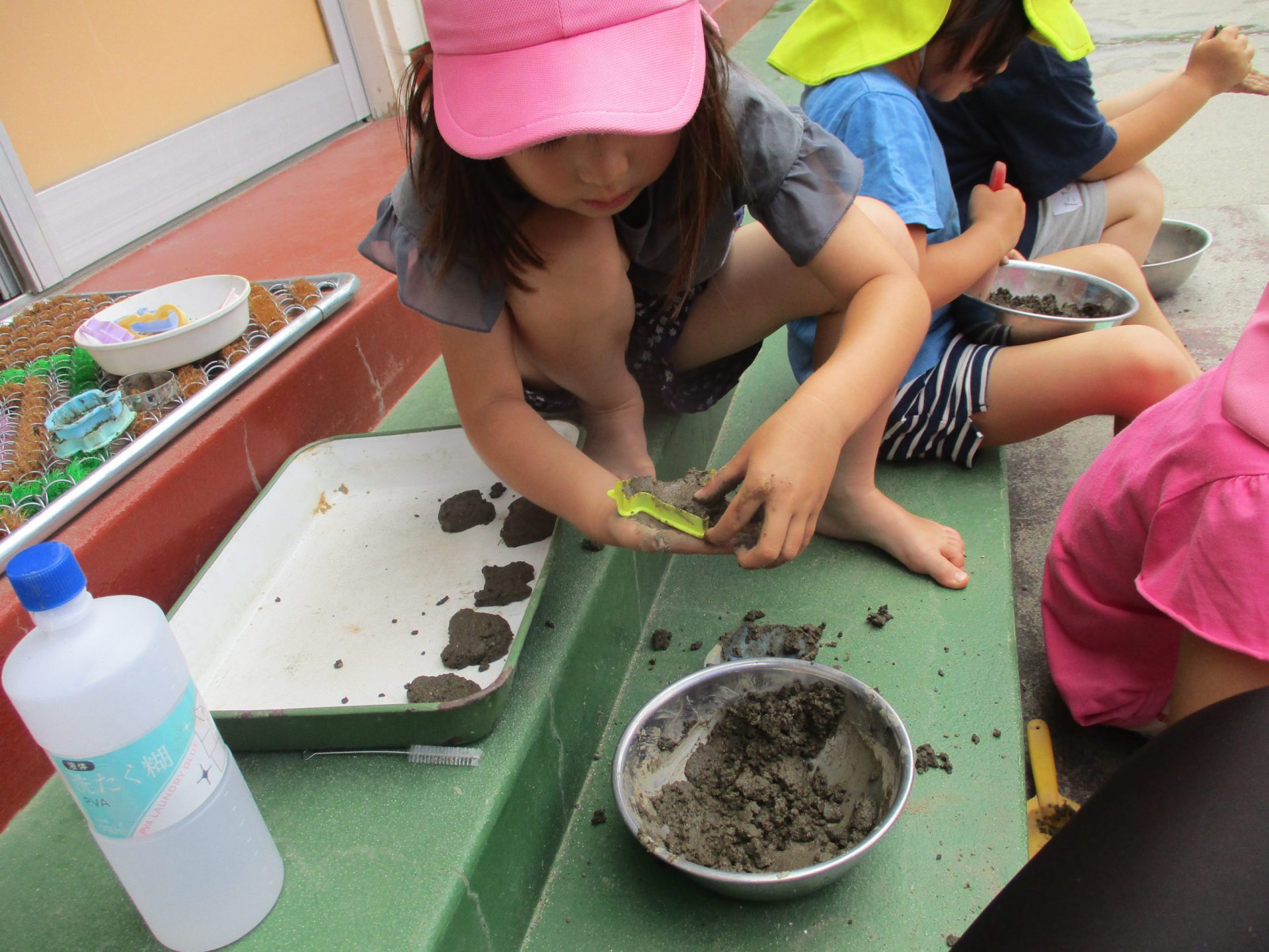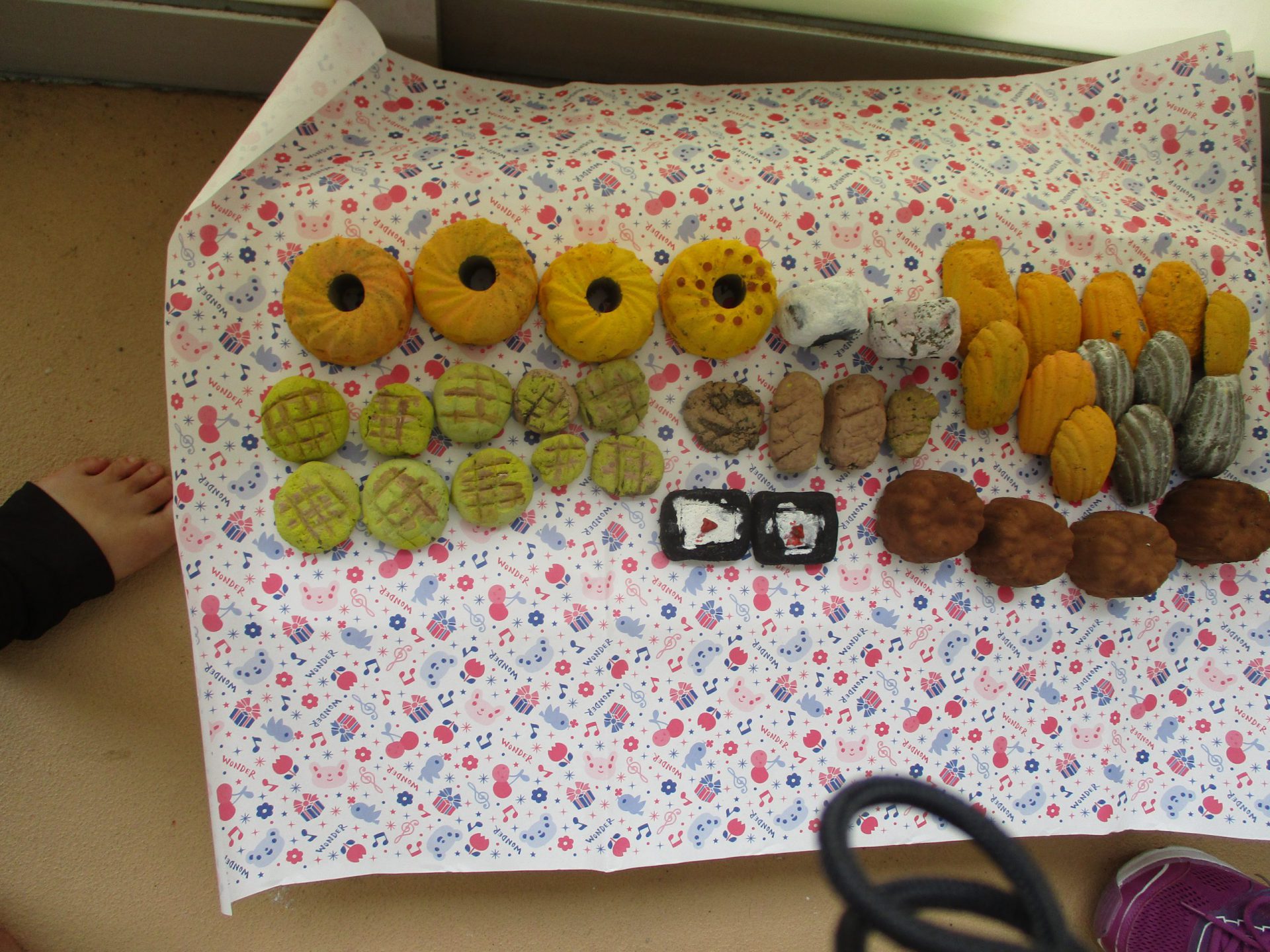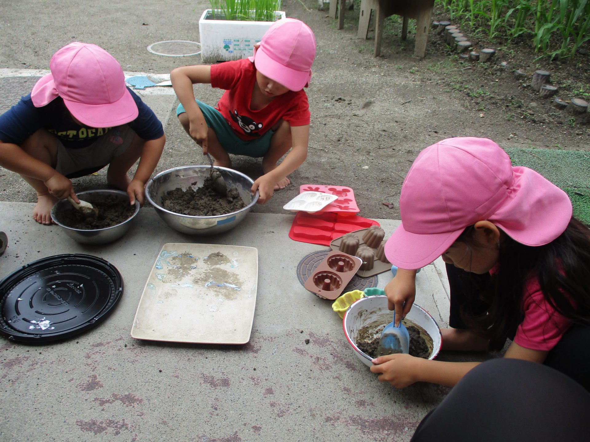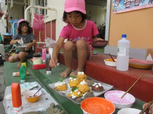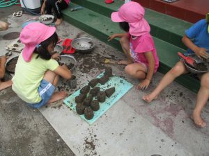 園庭の土で作ります! 土に洗濯のりを混ぜて形を作り、型抜きや手で整えて、おぼんに並べます。乾くまで待ちますよ。