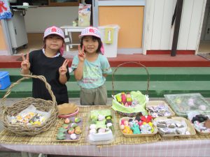 年長さんがどんな物を作って売りたいか、少し前に話し合い、今日まで準備してきました。そして待ちに待ったお店屋さん✨どんな反応をしてくれるか楽しみ~😊