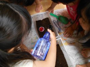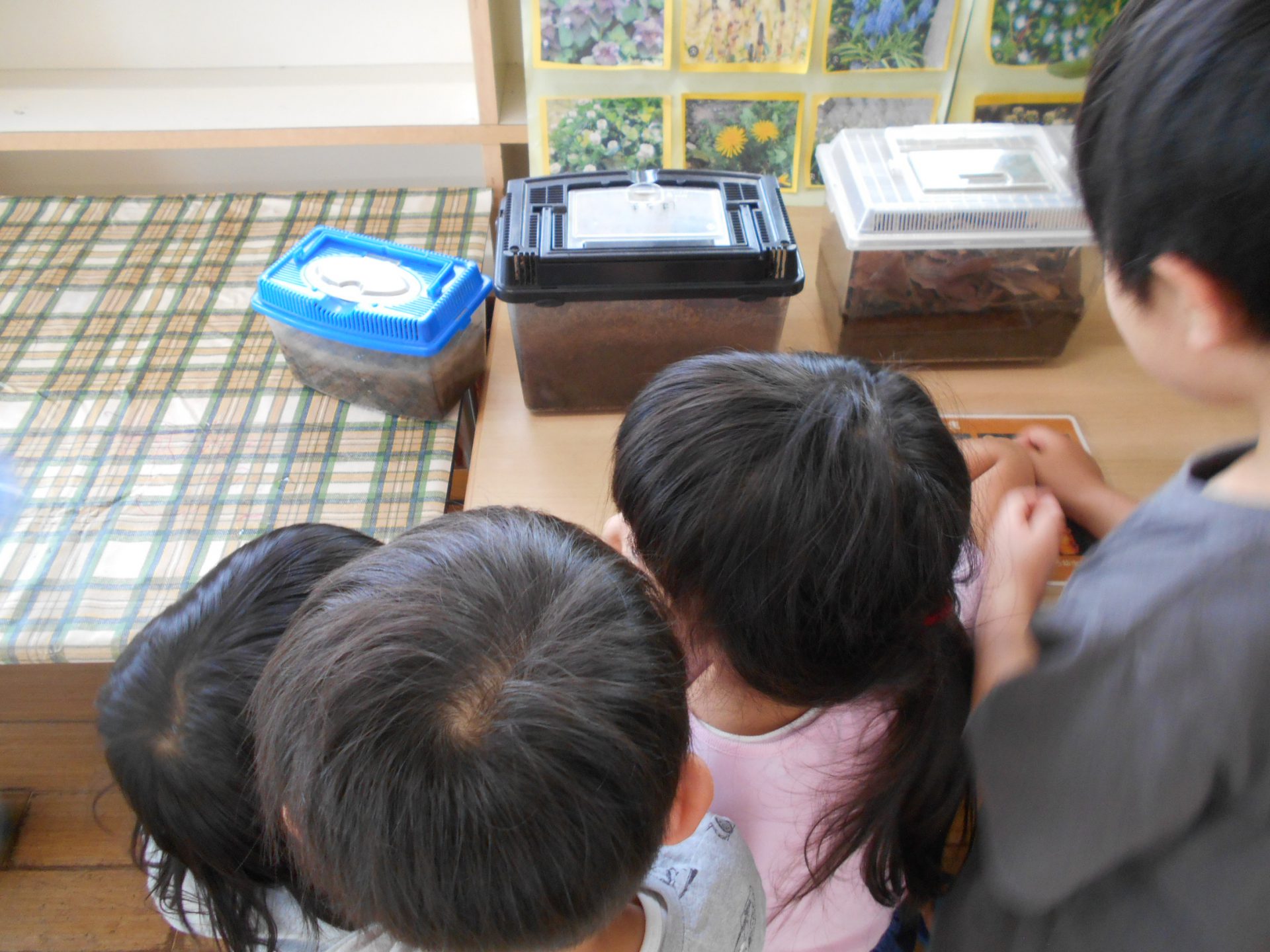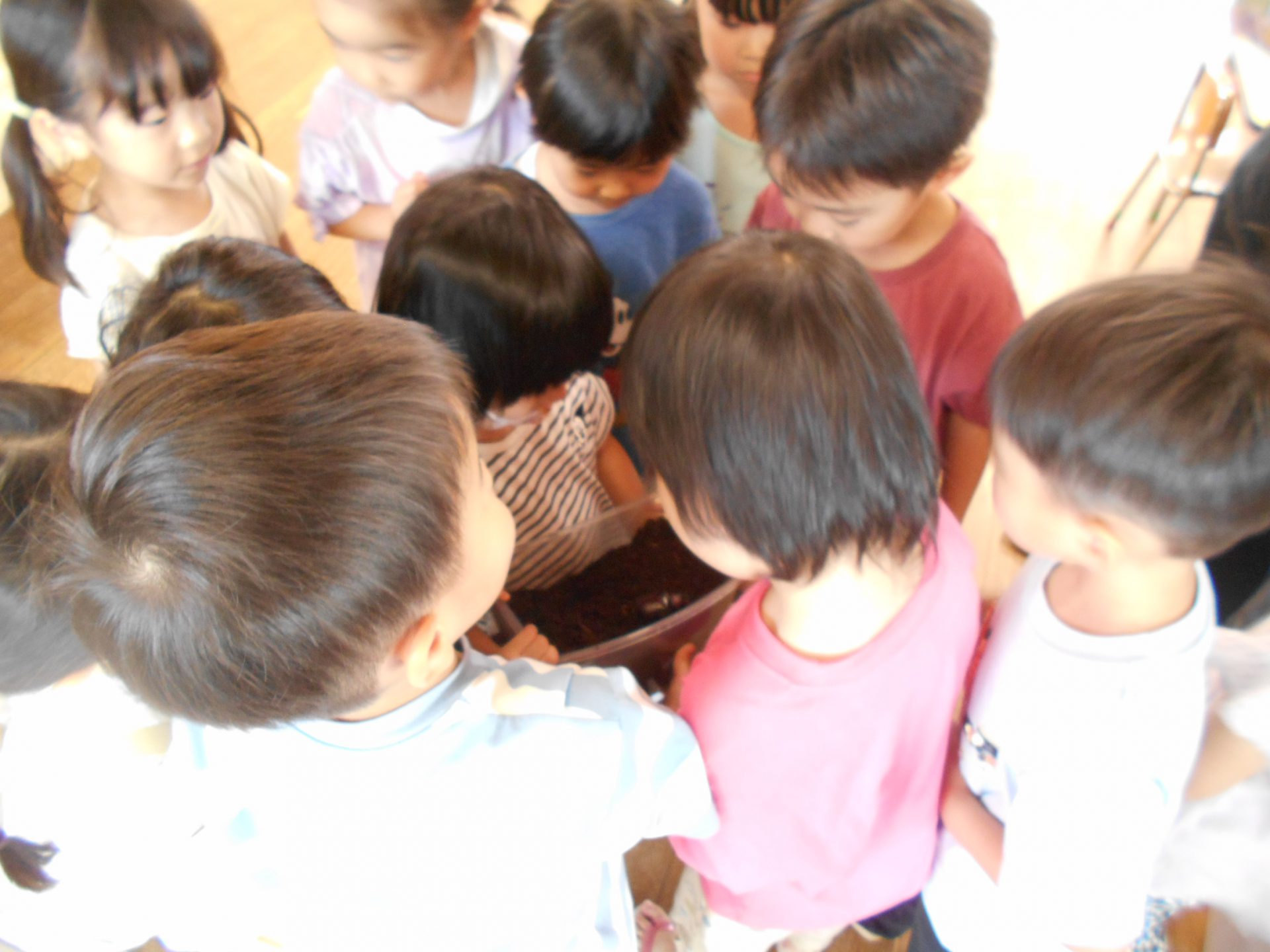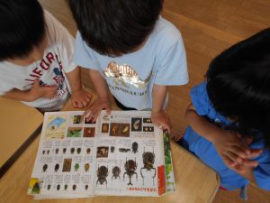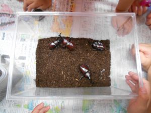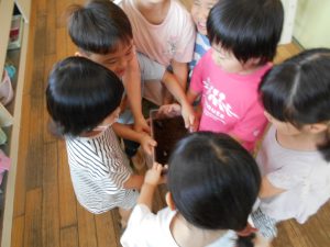 初めての経験の中で「すごい!」「○○なんだね!」という興味や発見とともに、「なんで○○なんだろう?」「どうして?」という疑問をもつ姿も多く見られました。子どもと一緒に図鑑を見たり、クラスの子ども同士、おうちの方とも一緒に考えたりしながらカブトムシの成長を知るよい経験となりました。今後も、子どもたちの発見や「どうして?」「なんで?」の思いに寄り添いながら生き物との関わりを一緒に楽しんでいきたいです。