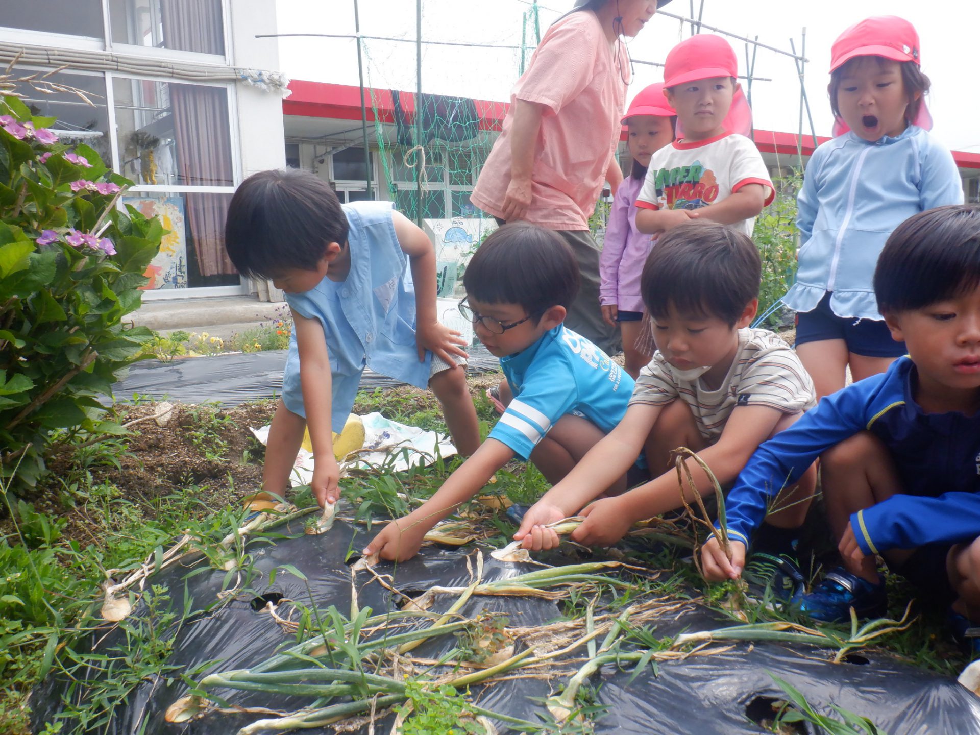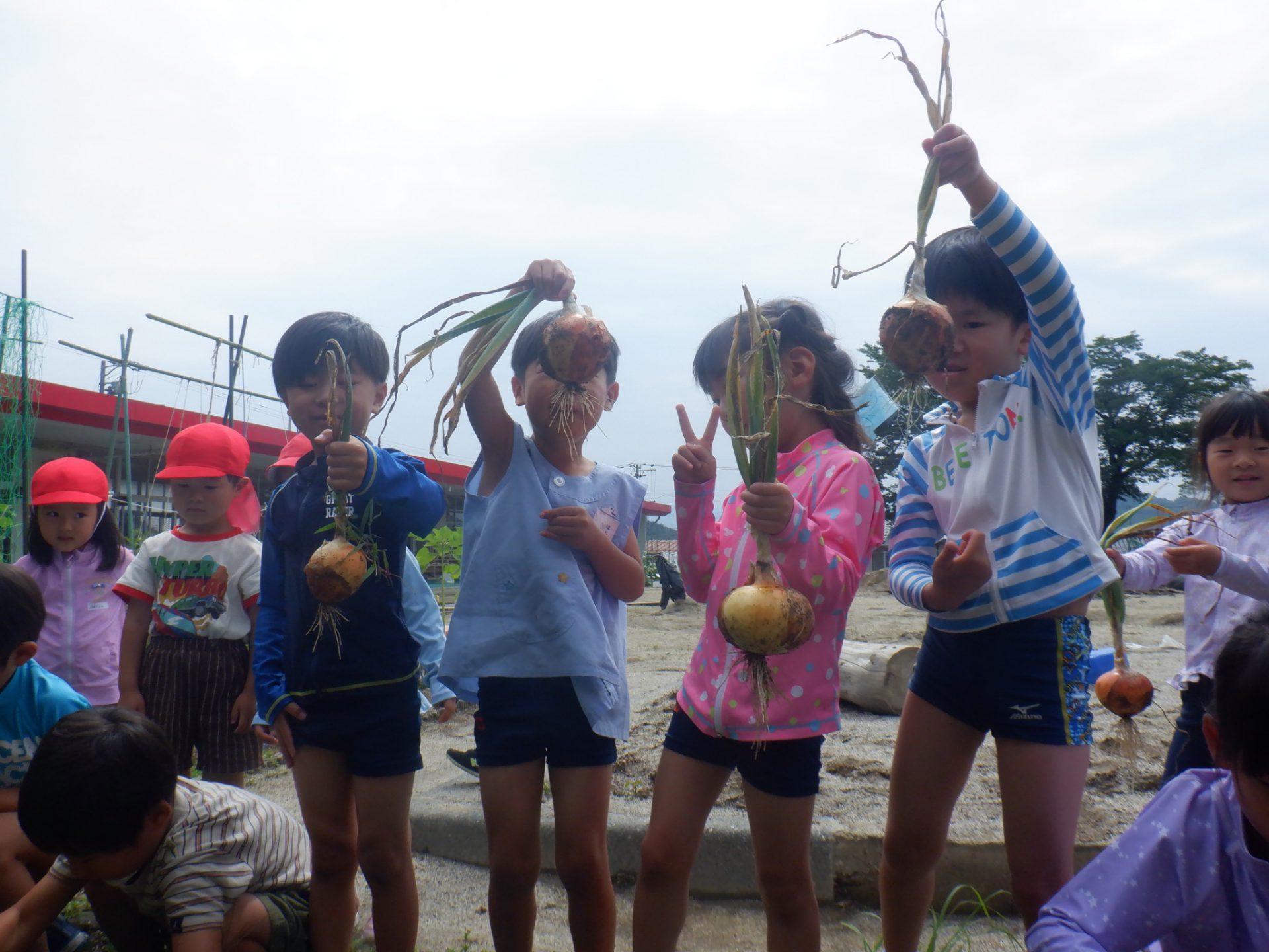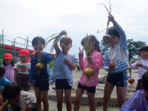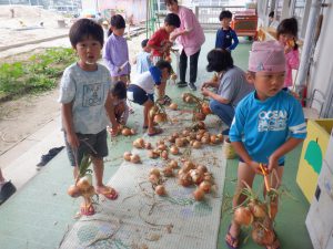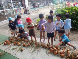 園庭にある畑に育てていた玉ねぎが茎、葉が倒れて収穫の時期を迎え、年長さんを中心に収穫をしました。