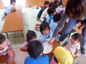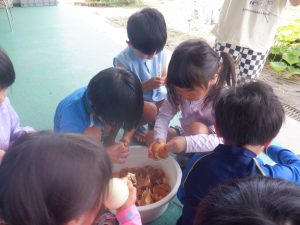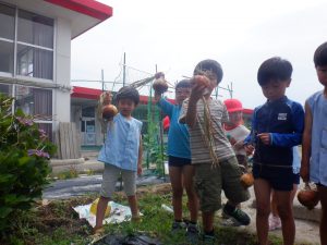 ・保育園の庭の畑で、毎日生長していく様子を見てきた野菜たちを、皆でちょっといつもと違う特別感を味わいながら食べることができ、特別な味を味わえたと思います。子どもたちの笑顔が物語っていました。