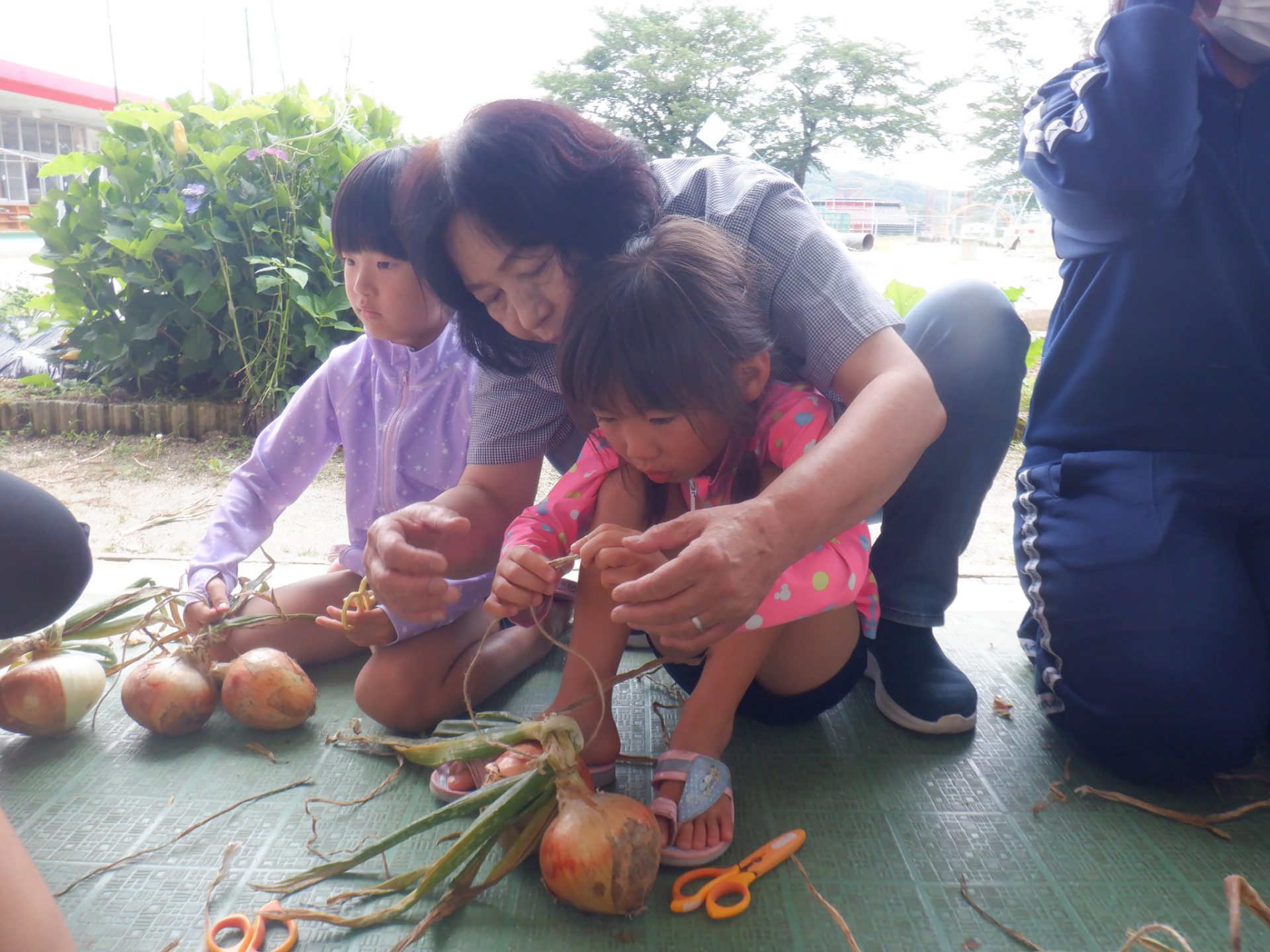 先生に教えてもらいながら玉ねぎを結びます。