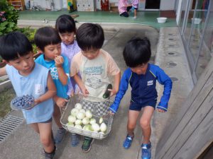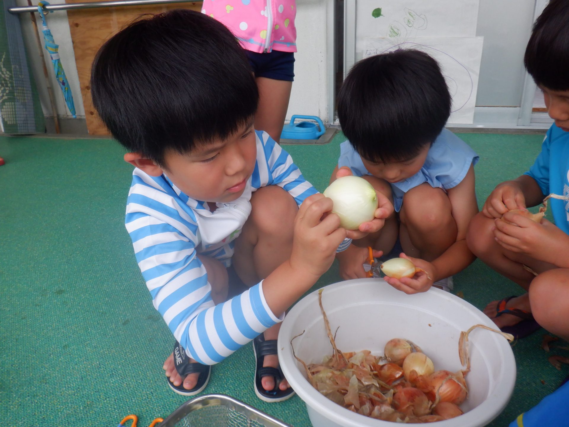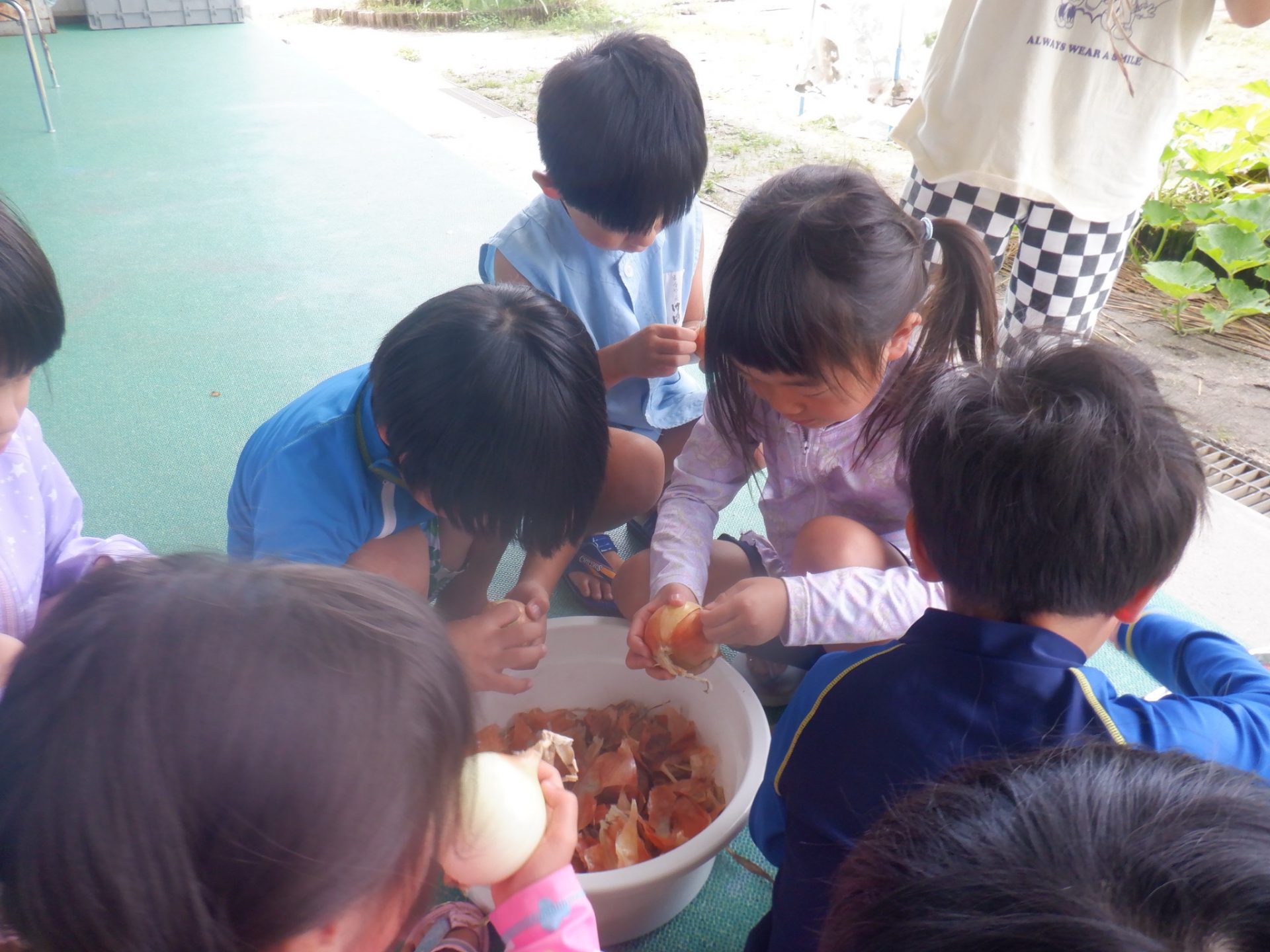 保育園では「玉ねぎパーティー」しようと年長さんが玉ねぎの皮をむき始めました。