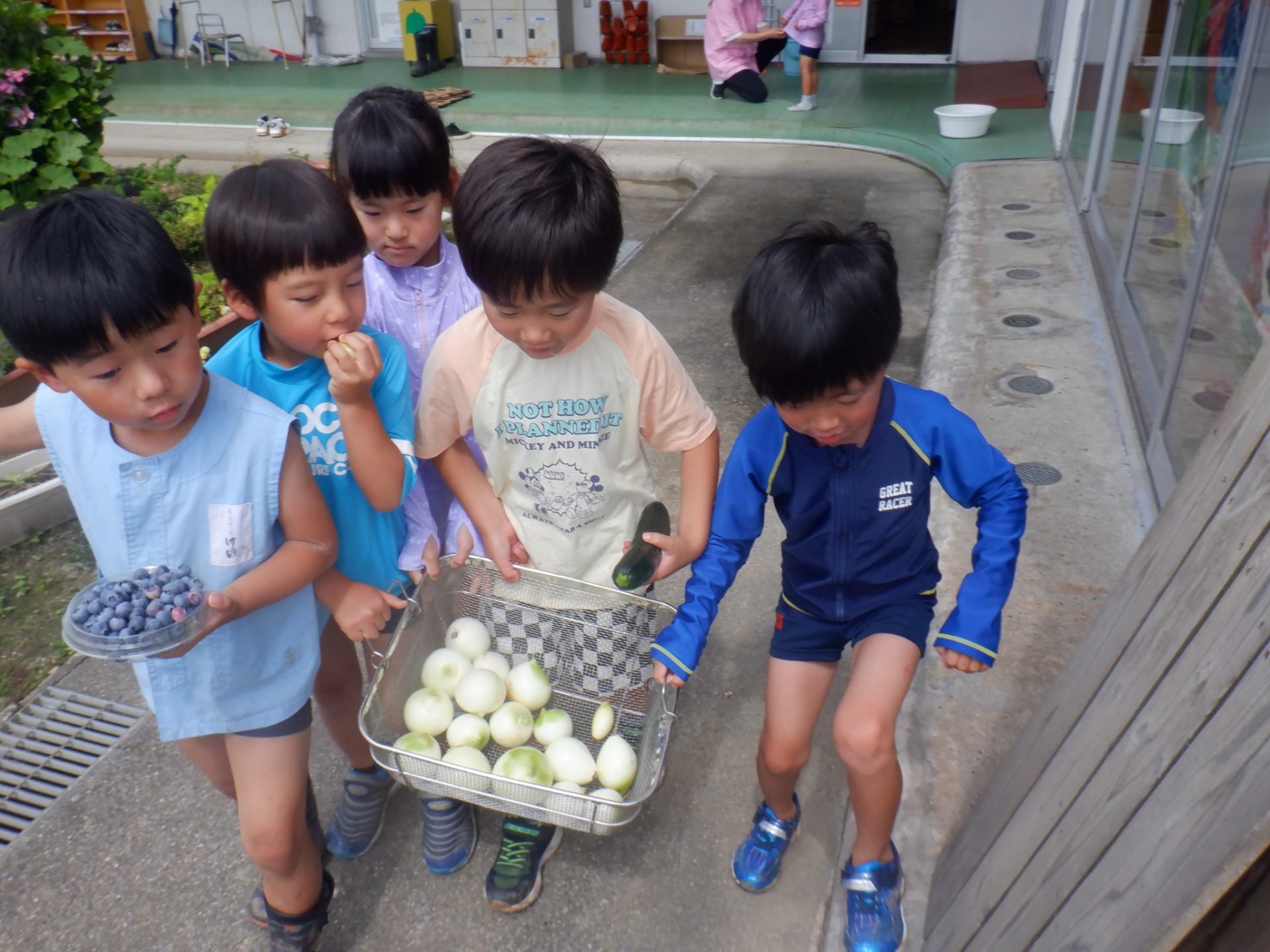 頑張ってむいた玉ねぎを園長先生の待っているホールへ運びます。