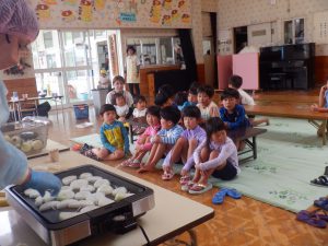 焼けるのを皆で待っています。だんだんいい匂いがしてきました。