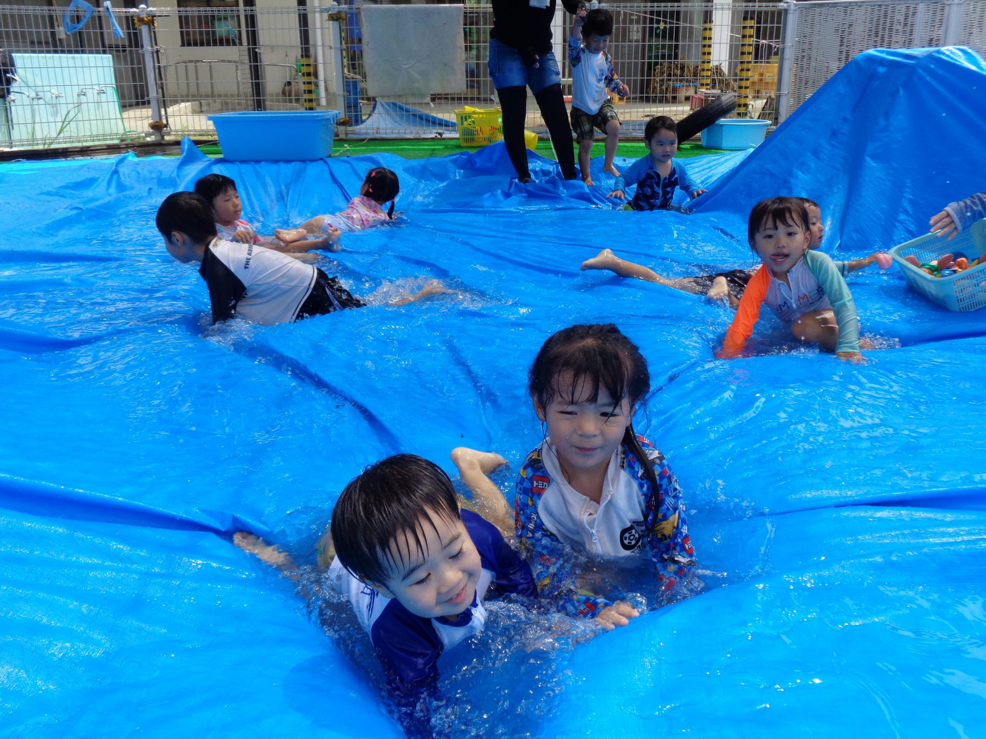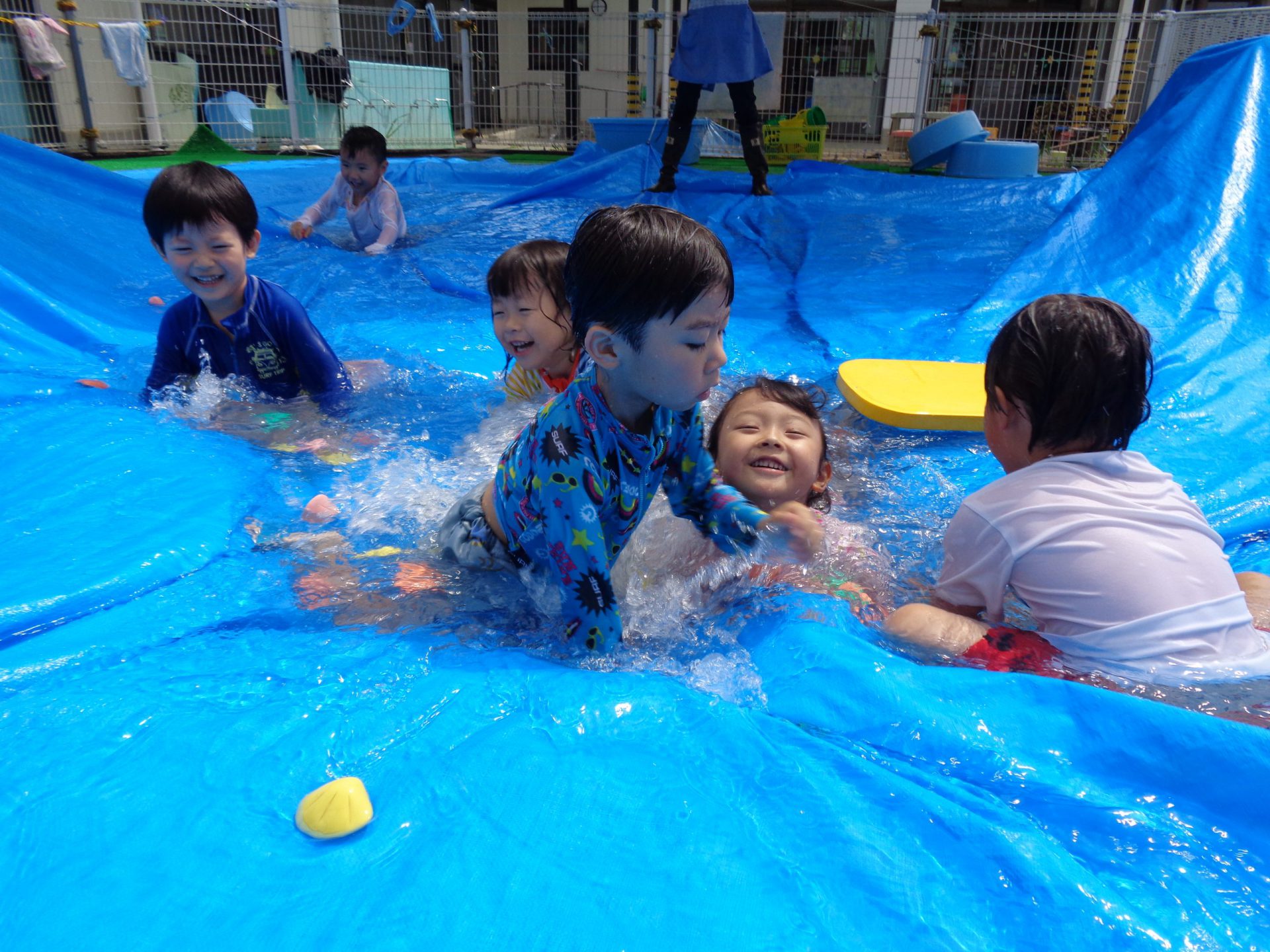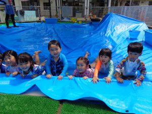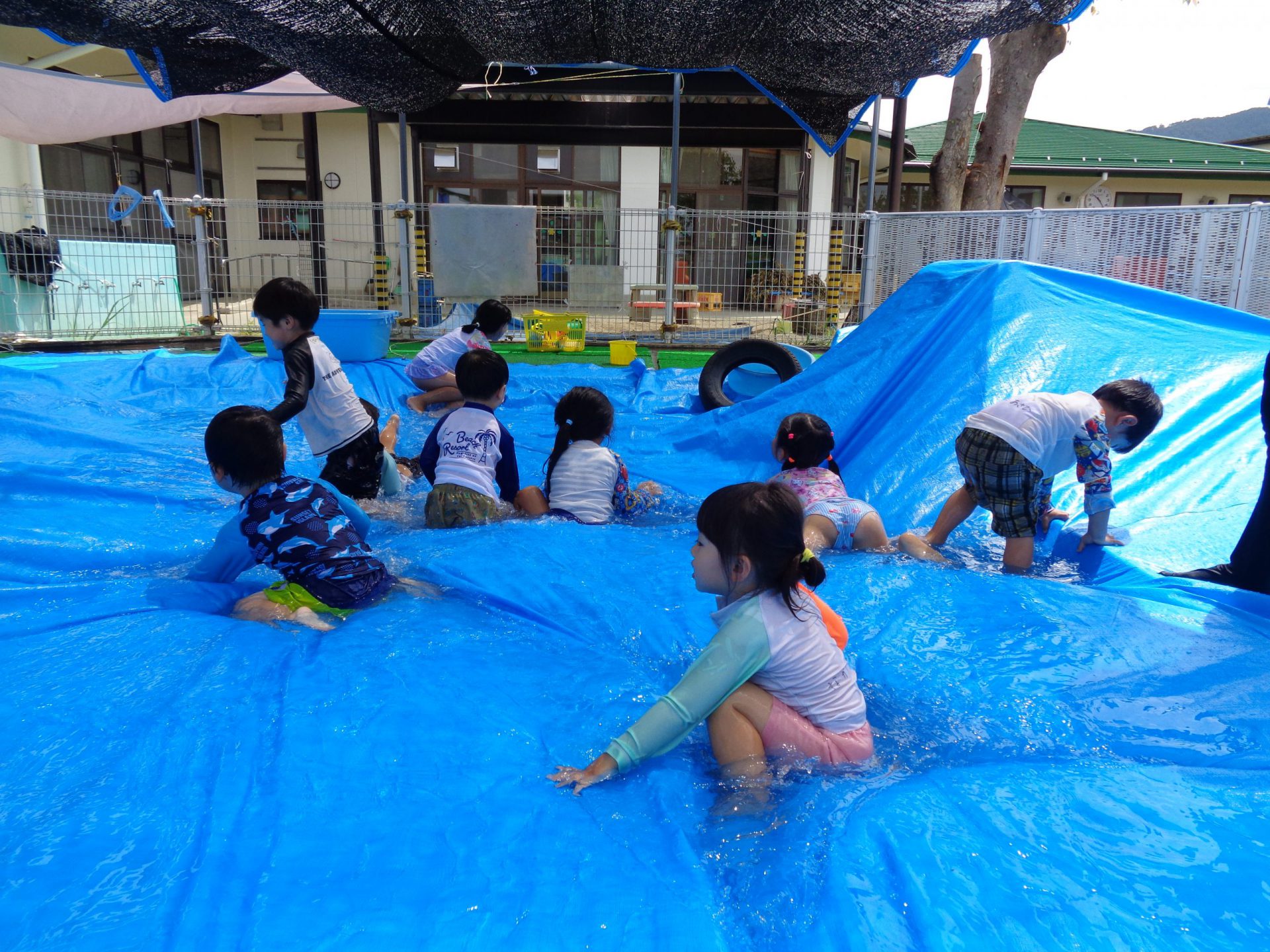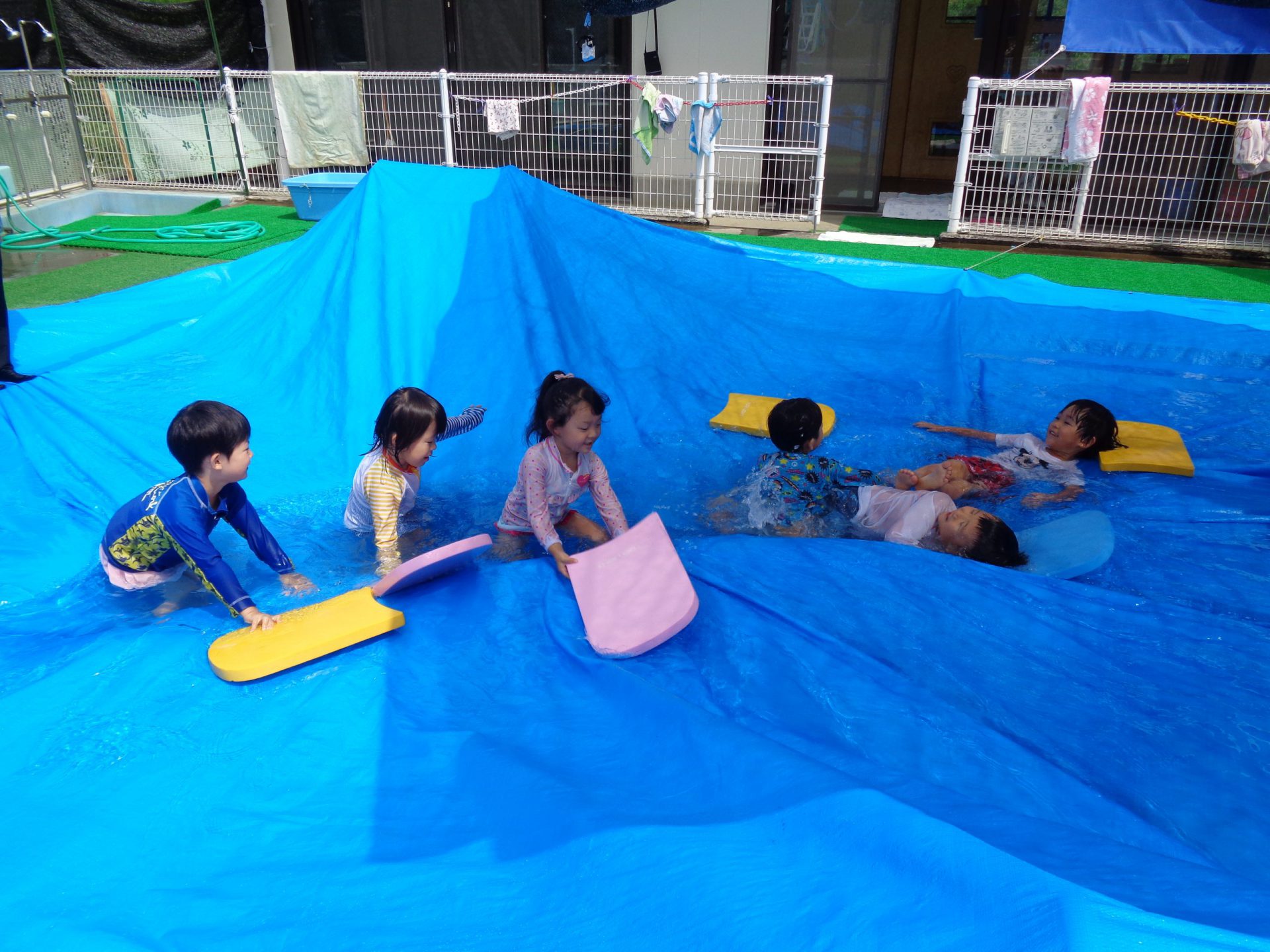 今日は、プールにブルーシートを敷き、みんなでウォーターベッドの上で遊びました。
