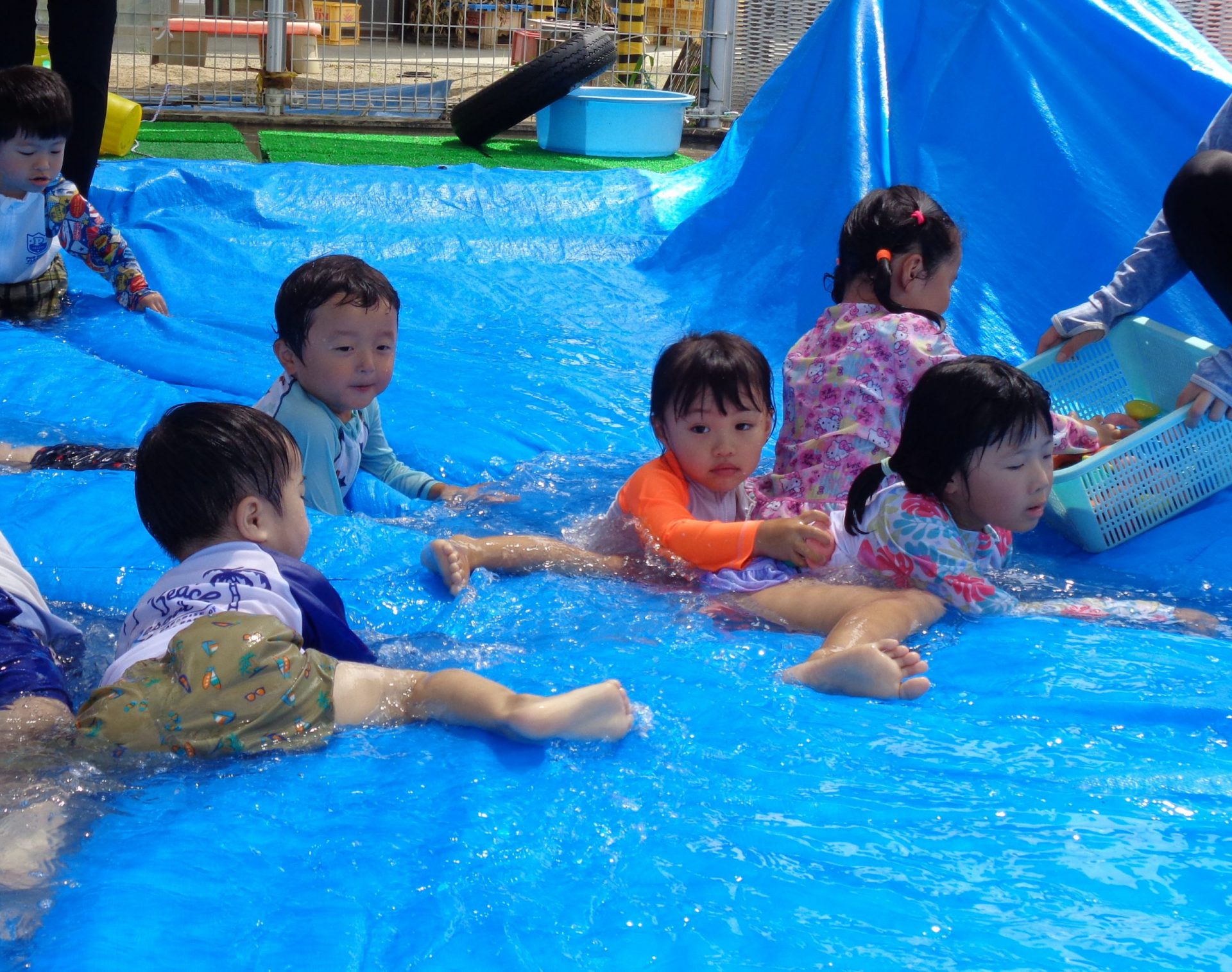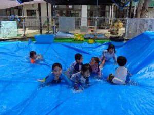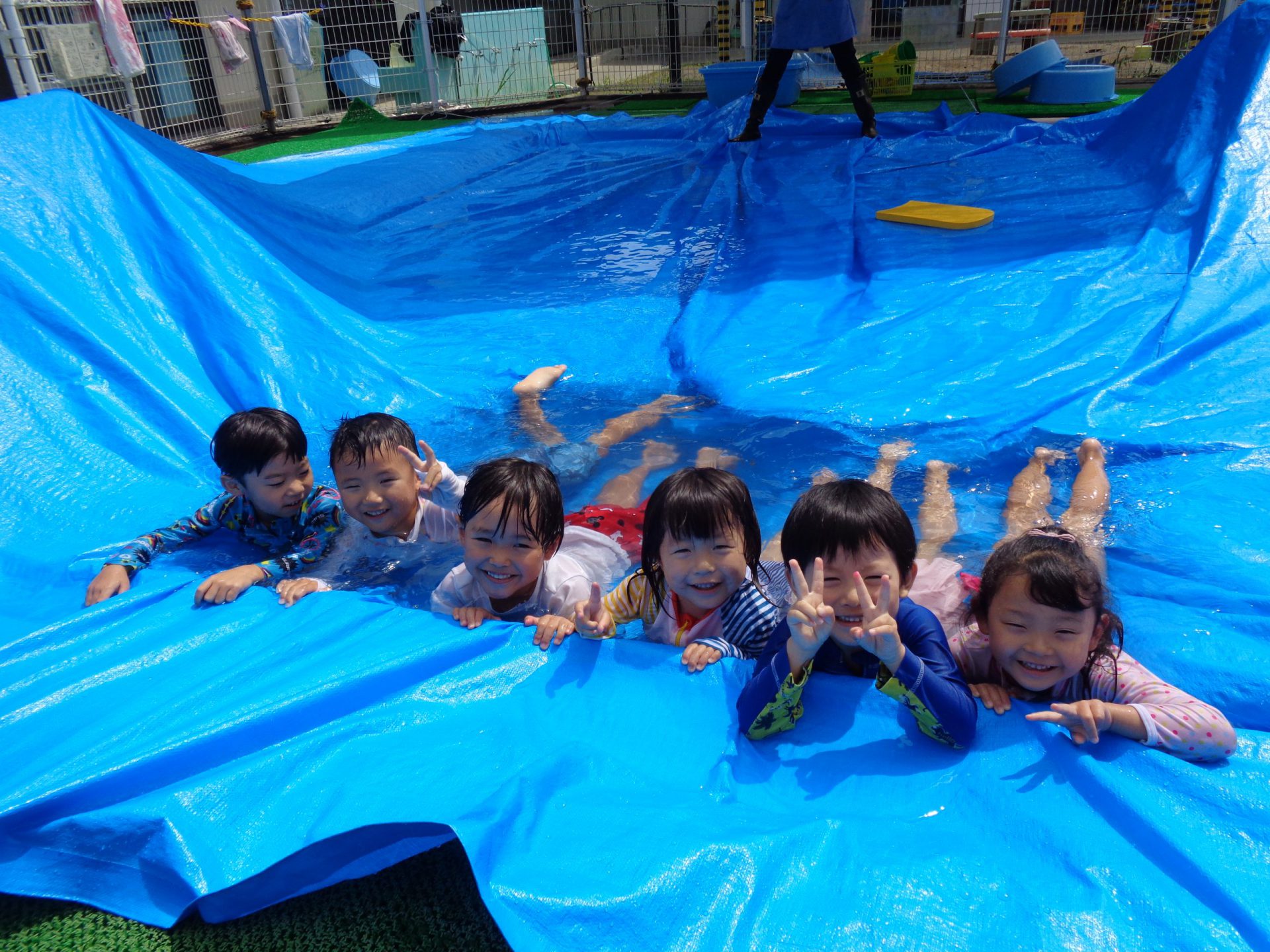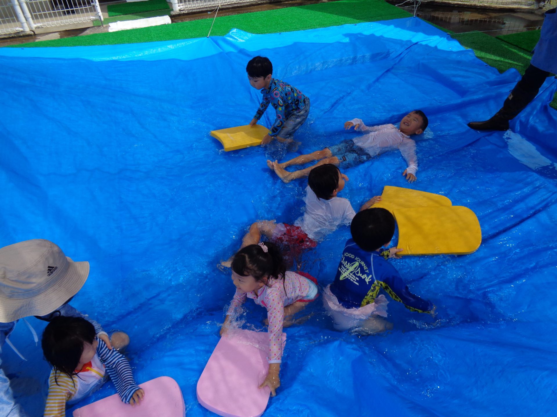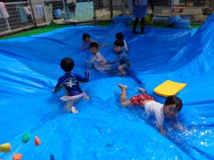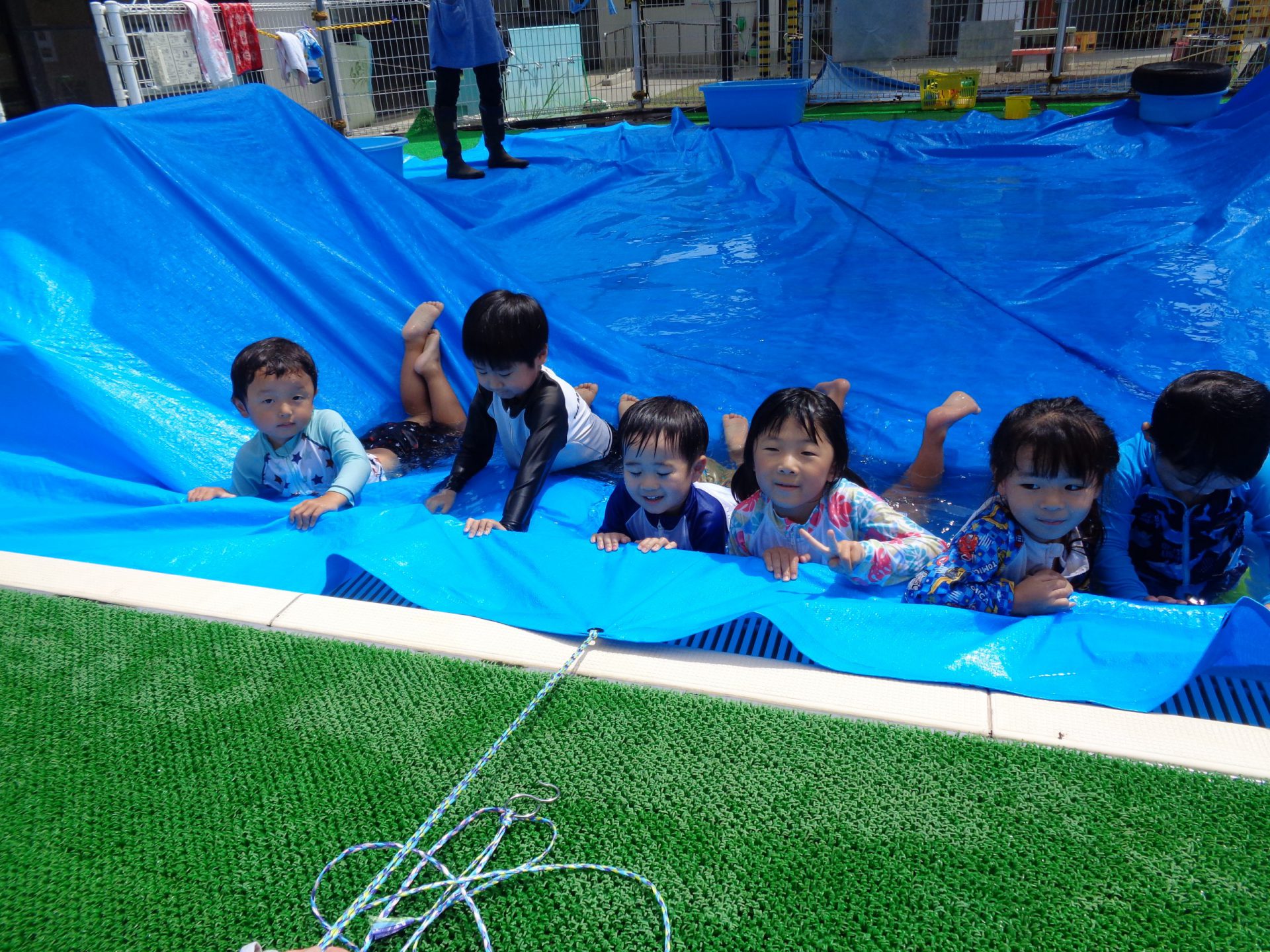 今日は、プールにブルーシートを敷き、みんなでウォーターベッドの上で遊びました。