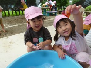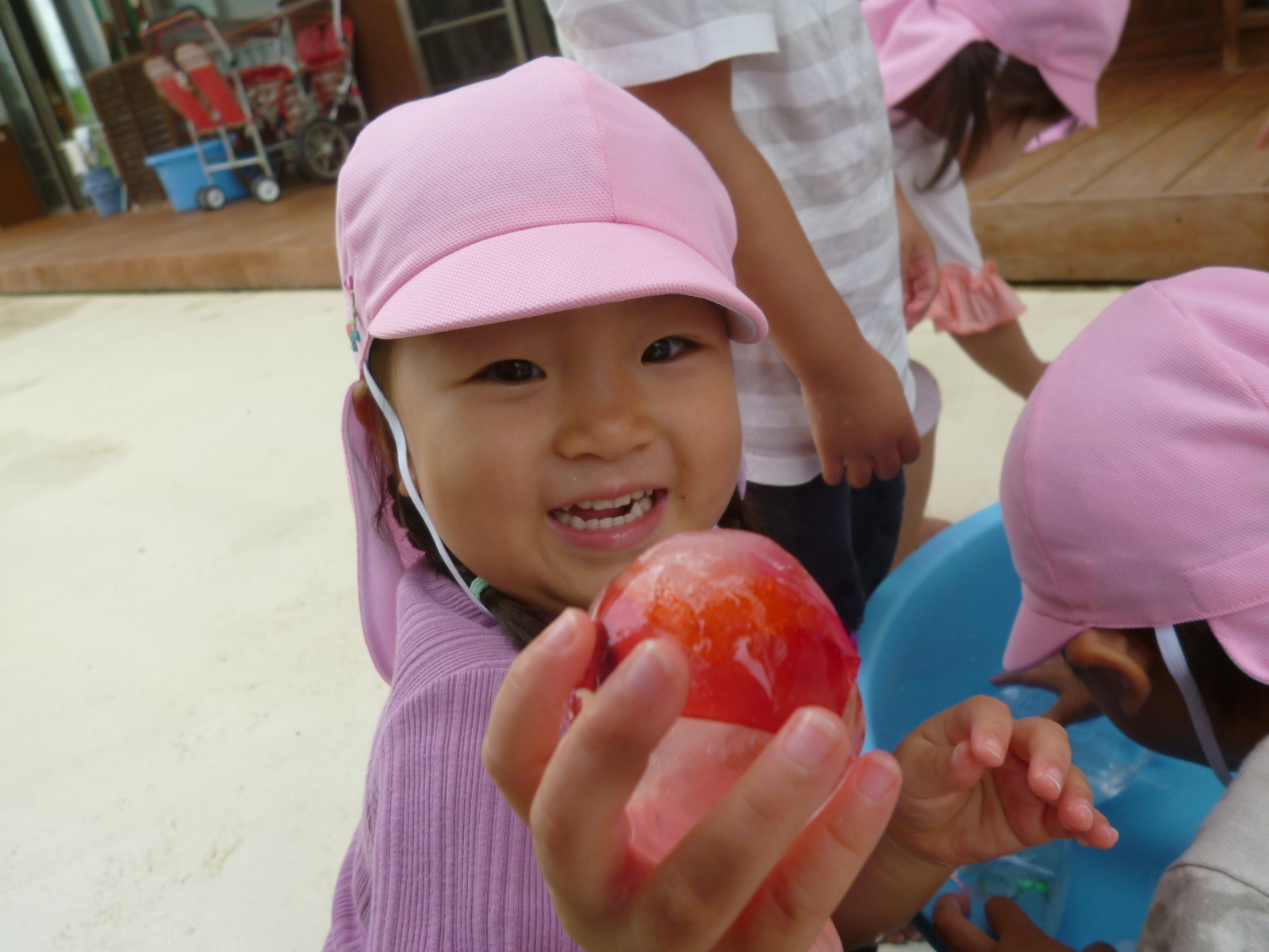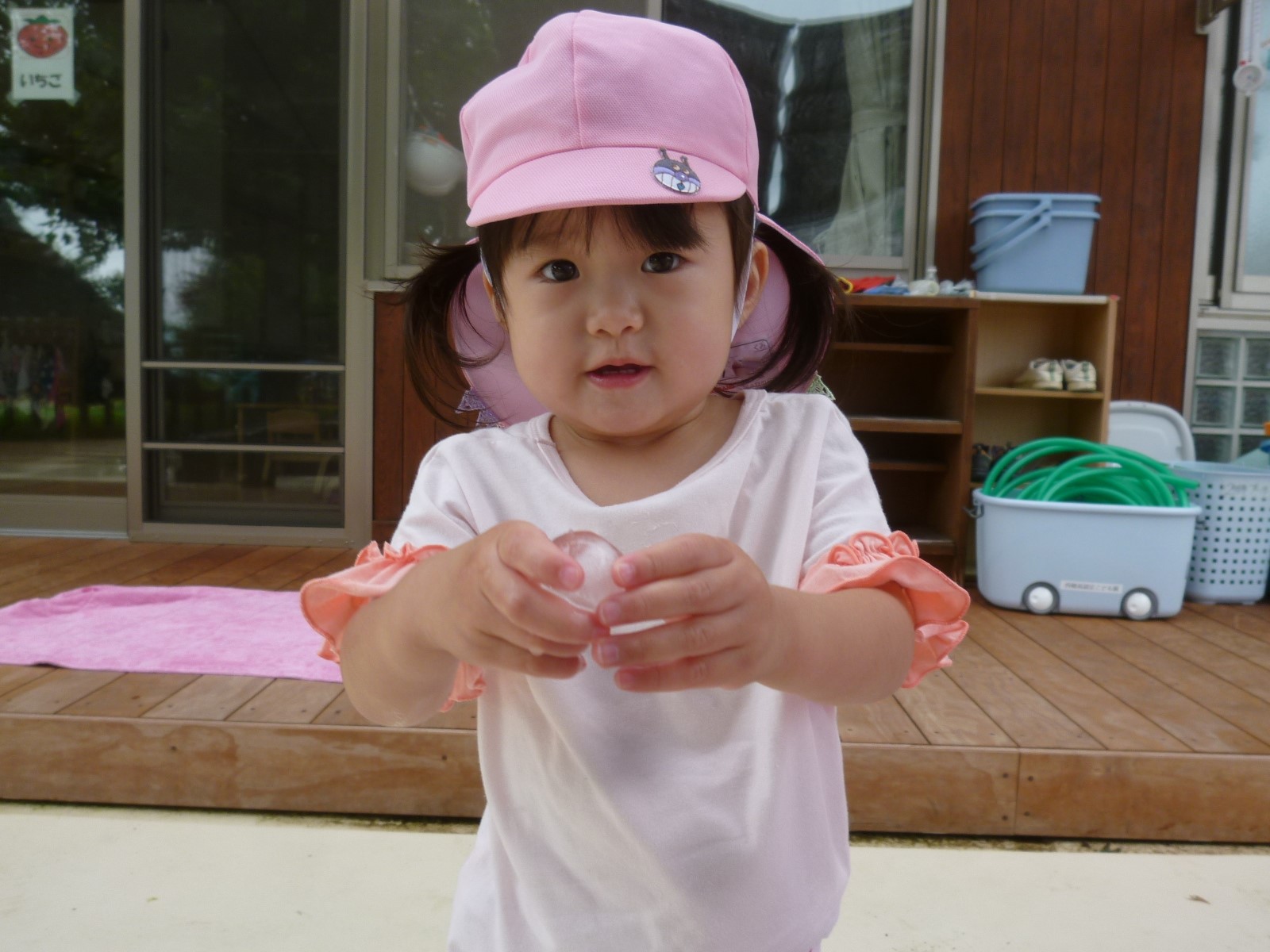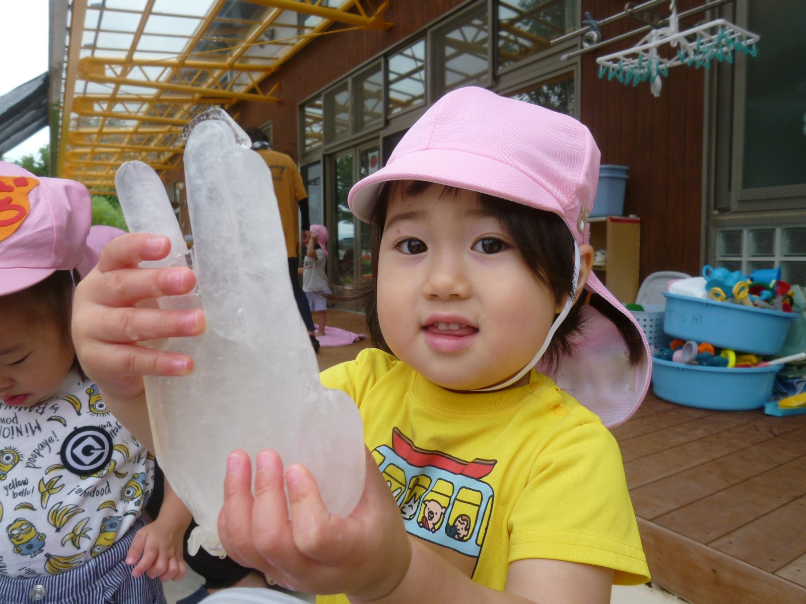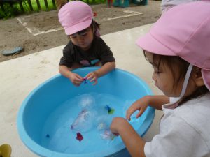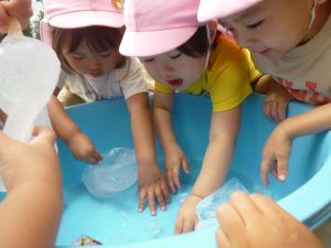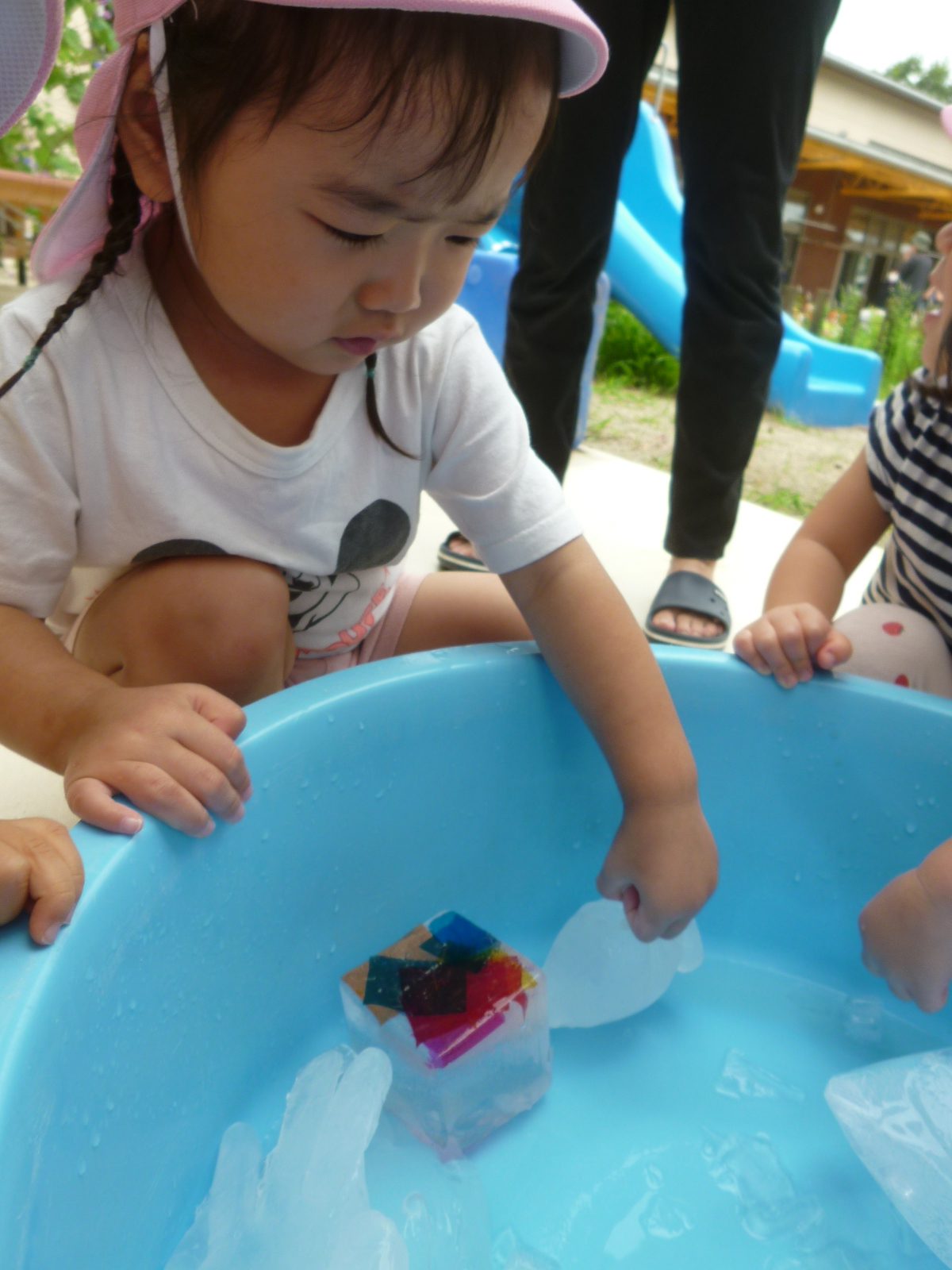 水遊びとは違う夏ならではの遊びとして、氷を使った遊びをしてみました。
