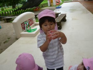 「あ〜あ なくなっちゃった〜」 と 氷が溶けてしまったタライを見つめ、ちょっと残念そうな子どもたち。