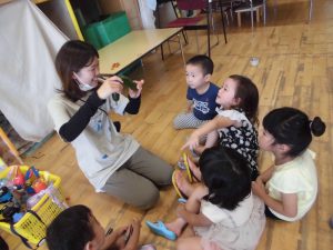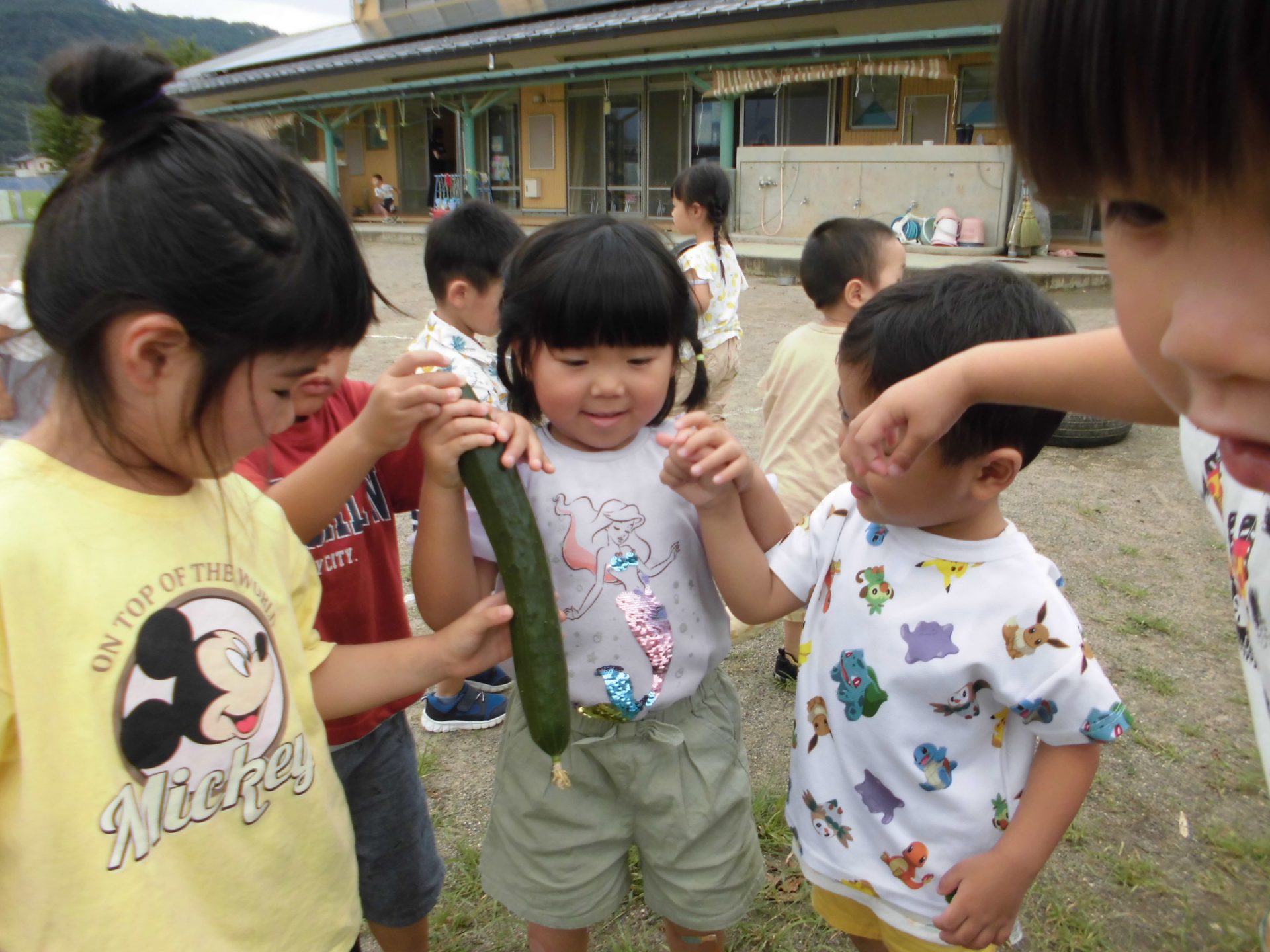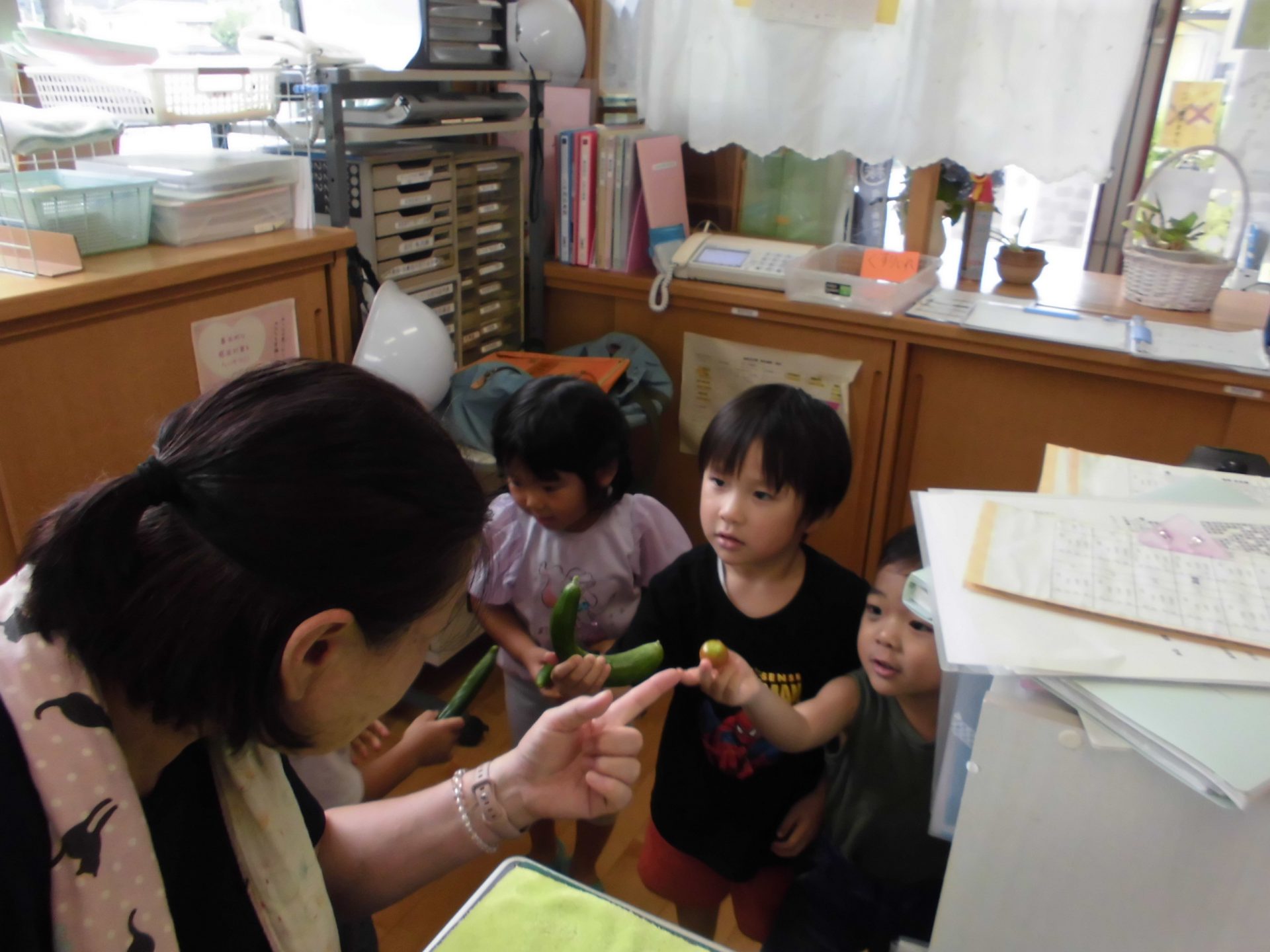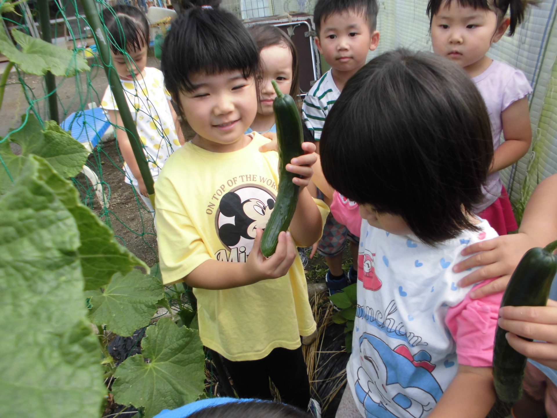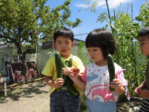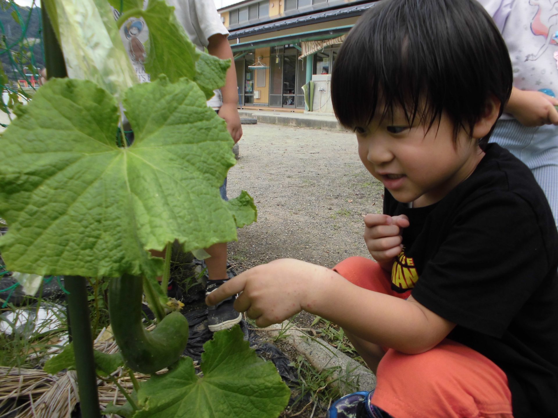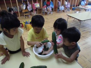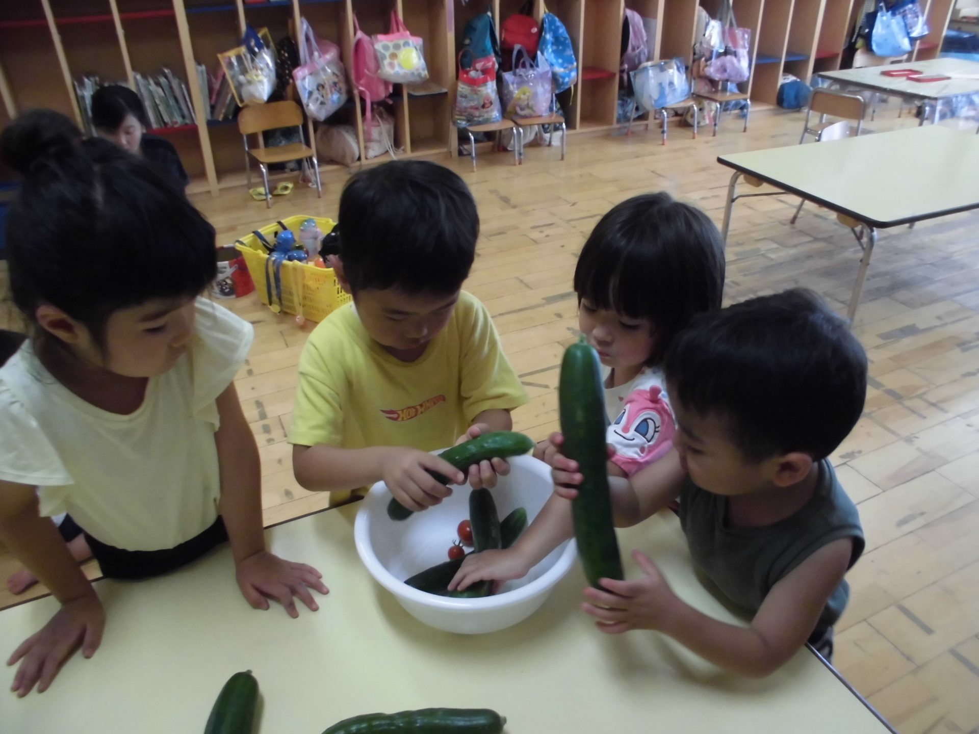 見る、触る、嗅ぐ、食べる、遊ぶなど、キュウリで色々な経験をすることができました。