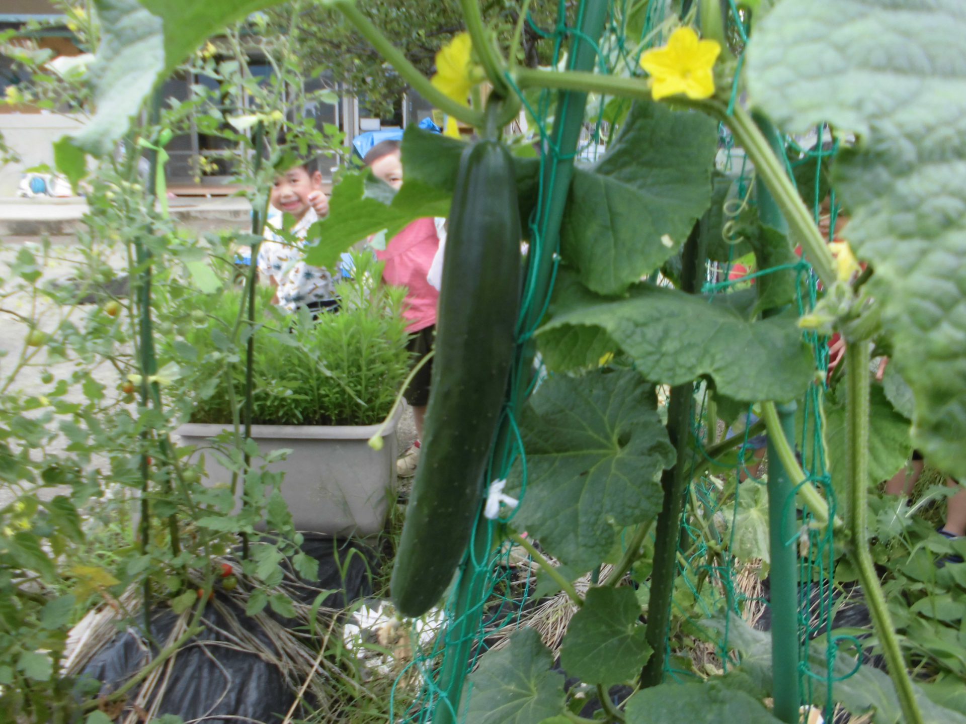 ・成長過程がわかりやすく、みんなが知っている親しみのある野菜、キュウリとトマトを育てた。毎日少しずつ変化があることや、水くれなどお世話をしないと大きくならないことに気づいてほしいと願いながら、栽培を始めた。