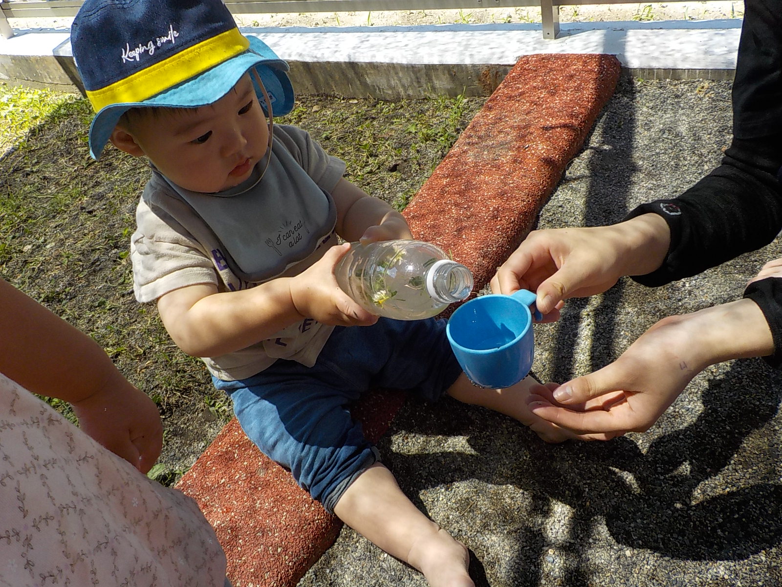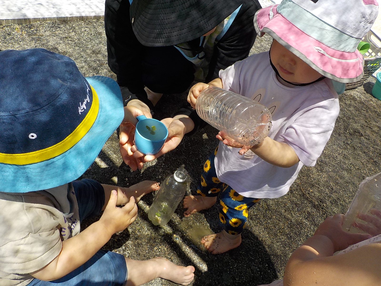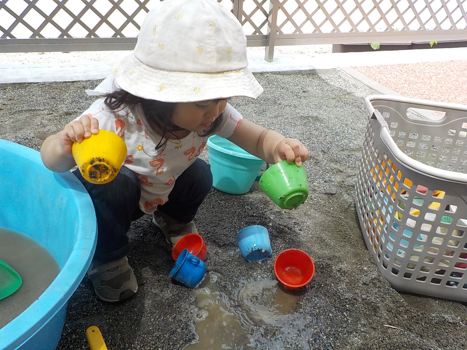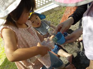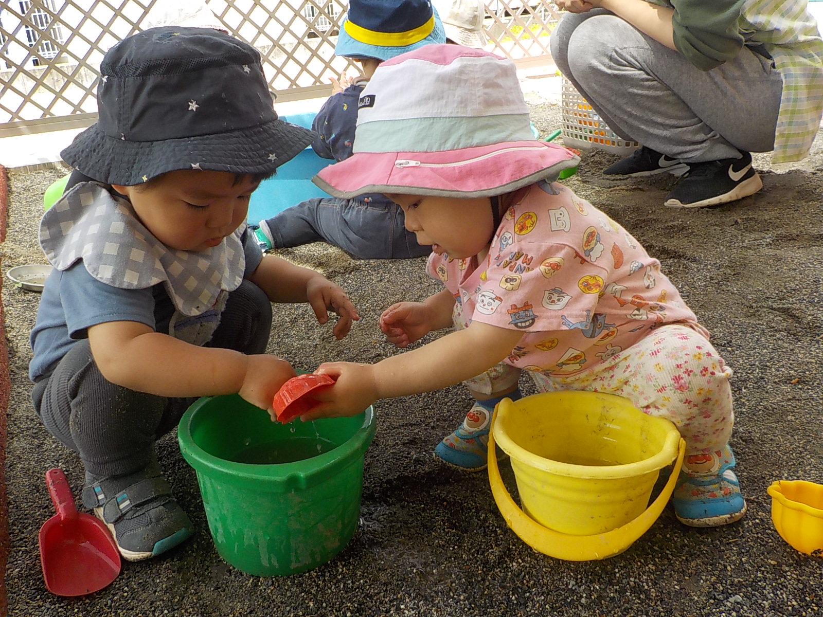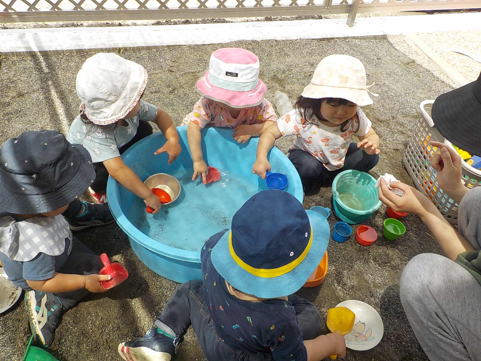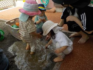 暑くなり始めた頃から、園庭にタライを出して水を入れると、早速集まってきて手を入れる子どもたち。