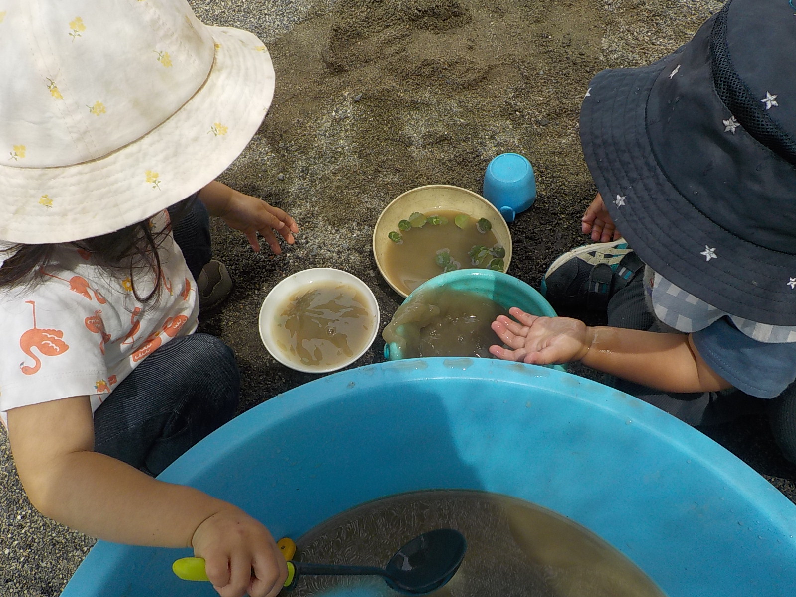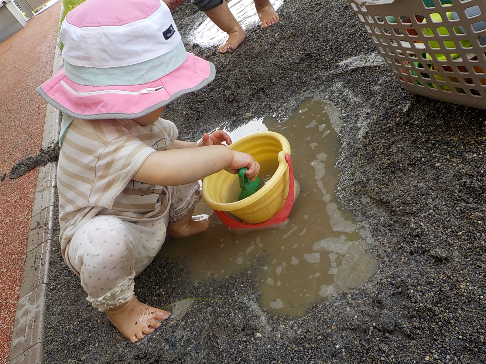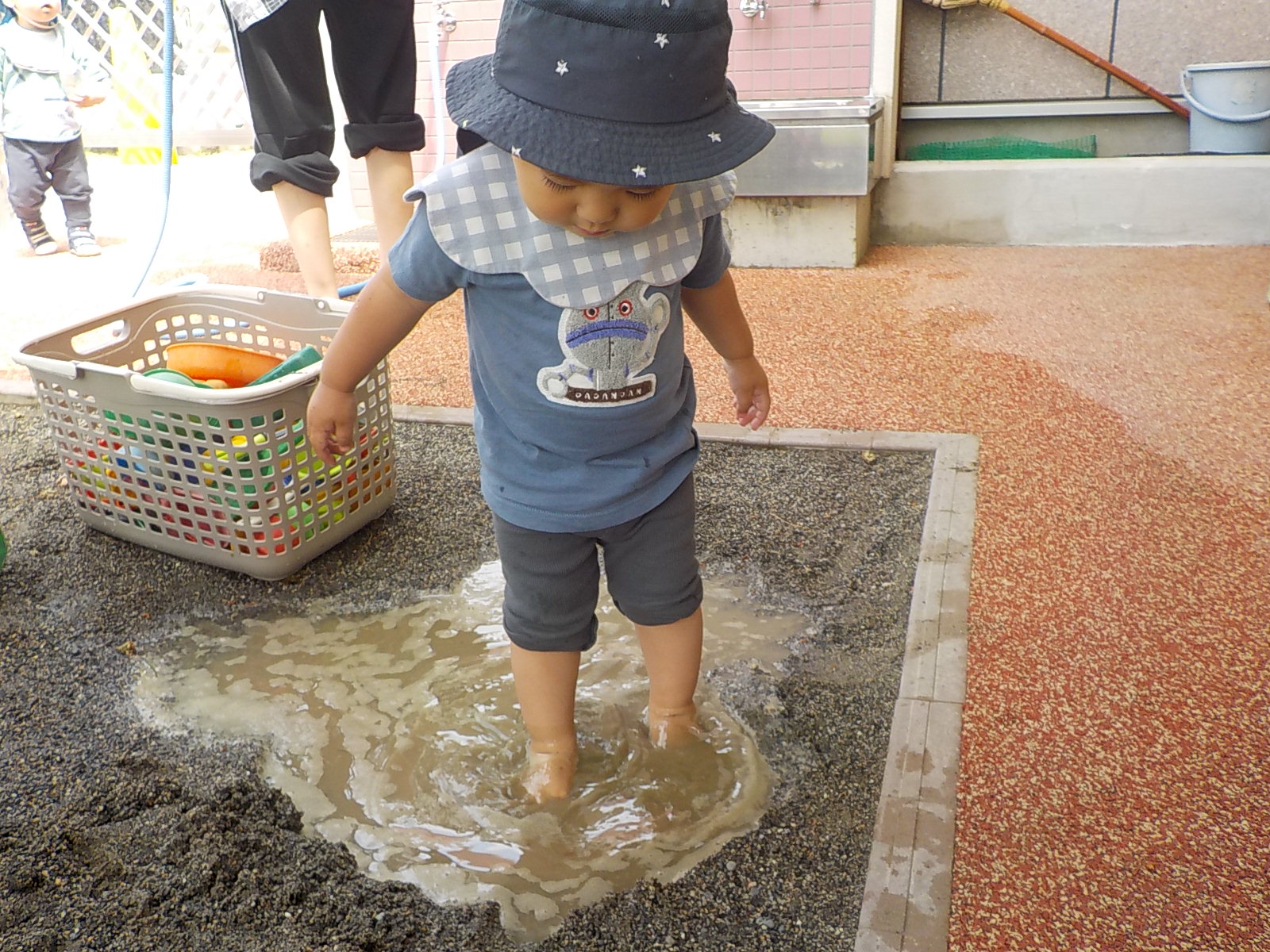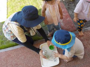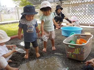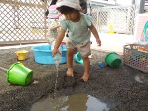 子ども達が大好きな戸外遊び、日頃親しんでいた砂遊びの中に水が加わることで、その感触の変化や気持ちよさに気づき、新しい発見をしたり、楽しさを感じて遊んで欲しいとねがいました。