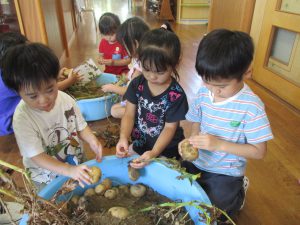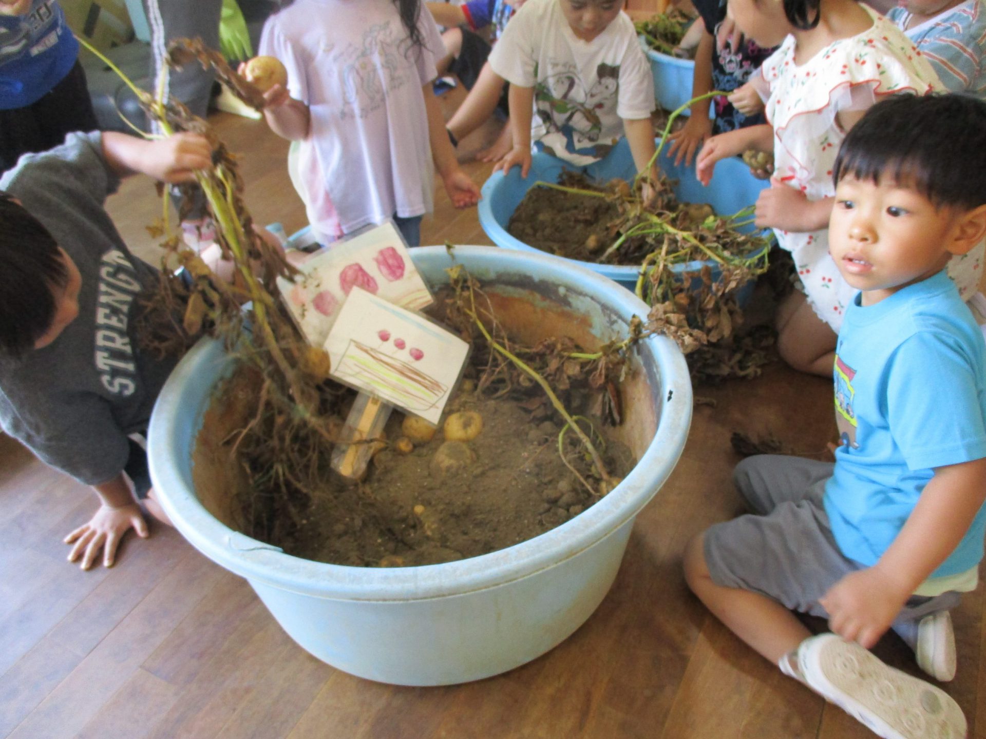 ・春に、園庭の畑に植えたじゃがいもの苗が、すっかり成長し、あっという間に収穫の時期になりました。