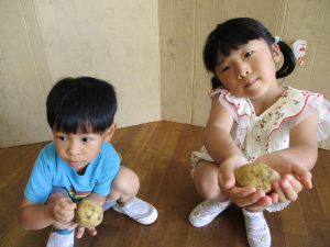 ・じゃがいもを何個か手に持って比較したり、友達同士でお互いに収穫したじゃがいもを見比べたり「大きいね!!」「これは(小さくて)かわいい!」と大きさに目を向けて言葉にしていました。