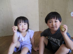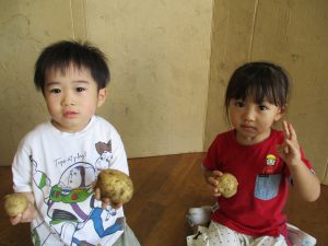 ・収穫の時に「じゃがいもくっついてる!」と苗の先にくっついているじゃがいもに驚きを見せる姿が見られました。子ども達の新たな発見でした。